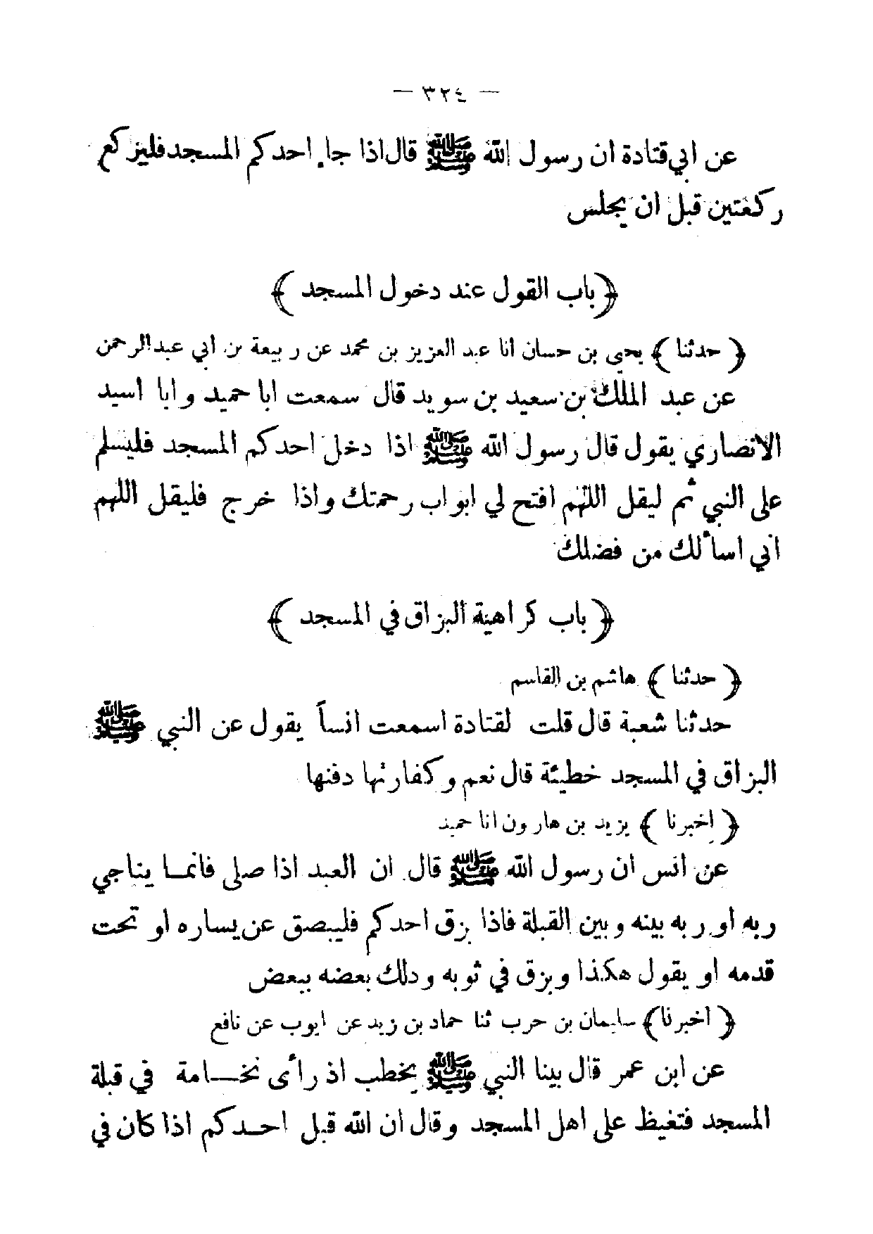 [ 324 ] عن ابي قتادة ان رسول الله صلى الله عليه وسلم قال إذا جاء احدكم المسجد فليركع ركعتين قبل ان يجلس
