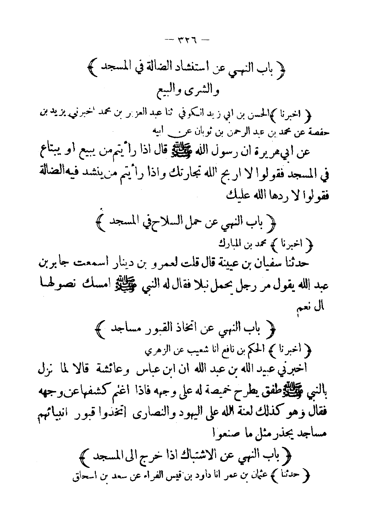 (أخبرنا) الحسن بن ابي زيد الكوفي ثنا عبد العزير بن محمد اخبرني يزيد بن حفصة عن محمد بن عبد الرحمن بن ثوبان عن ابيه عن ابي هريرة ان رسول الله صلى الله عليه وسلم قال إذا رأيتم من يبيع أو يبتاع في المسجد فقولوا لا اربح الله تجارتك وإذا رأيتم من ينشد فيه الضالة فقولوا لا ردها الله عليك