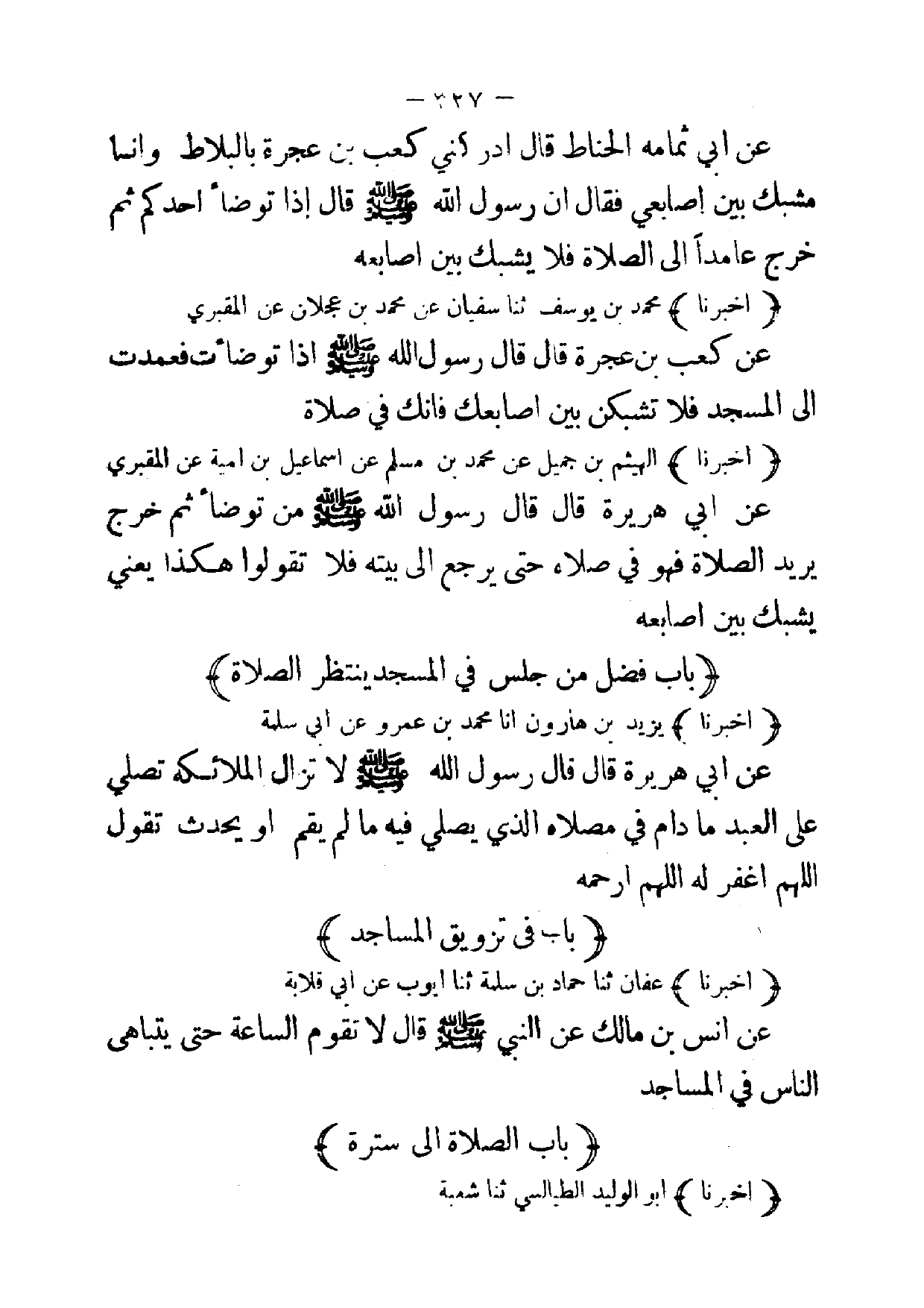 [ 327 ] عن ابي ثمامه الحناط قال ادركني كعب بن عجرة بالبلاط وانا مشبك بين اصابعي فقال ان رسول الله صلى الله عليه وسلم قال إذا توضأ احدكم ثم خرج عامدا إلى الصلاة فلا يشبك بين اصابعه