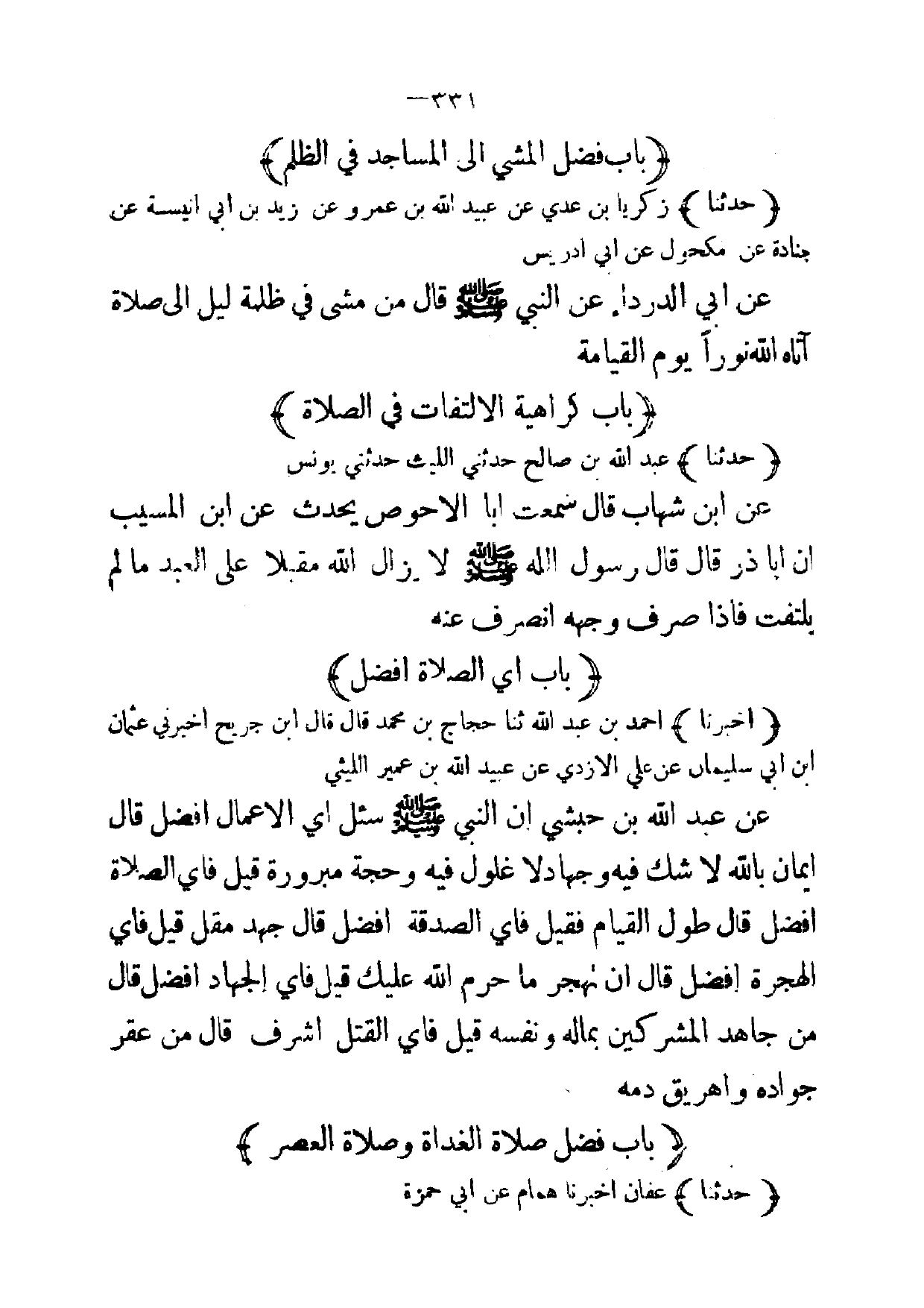 (حدثنا) زكريا بن عدي عن عبيدالله بن عمرو عن زيد بن ابي انيسة عن جنادة عن مكحول عن ابي ادريس عن ابي الدرداء عن النبي صلى الله عليه وسلم قال من مشى في ظلمة ليل إلى صلاة آتاه الله نورا يوم القيامة