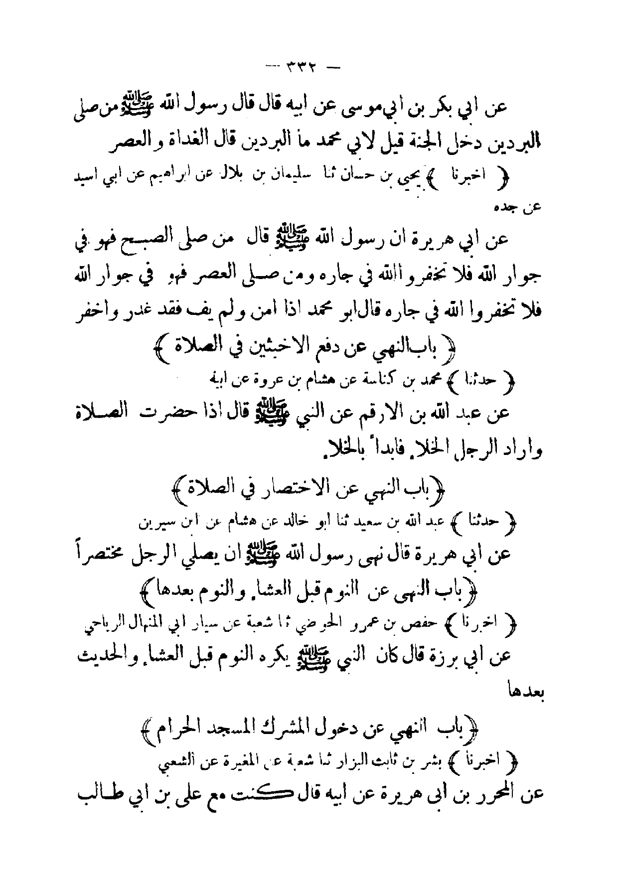 [ 332 ] عن ابي بكر بن ابي موسى عن ابيه قال قال رسول الله صلى الله عليه وسلم من صلى البردين دخل الجنة قيل لابي محمد ما البردين قال الغداة والعصر