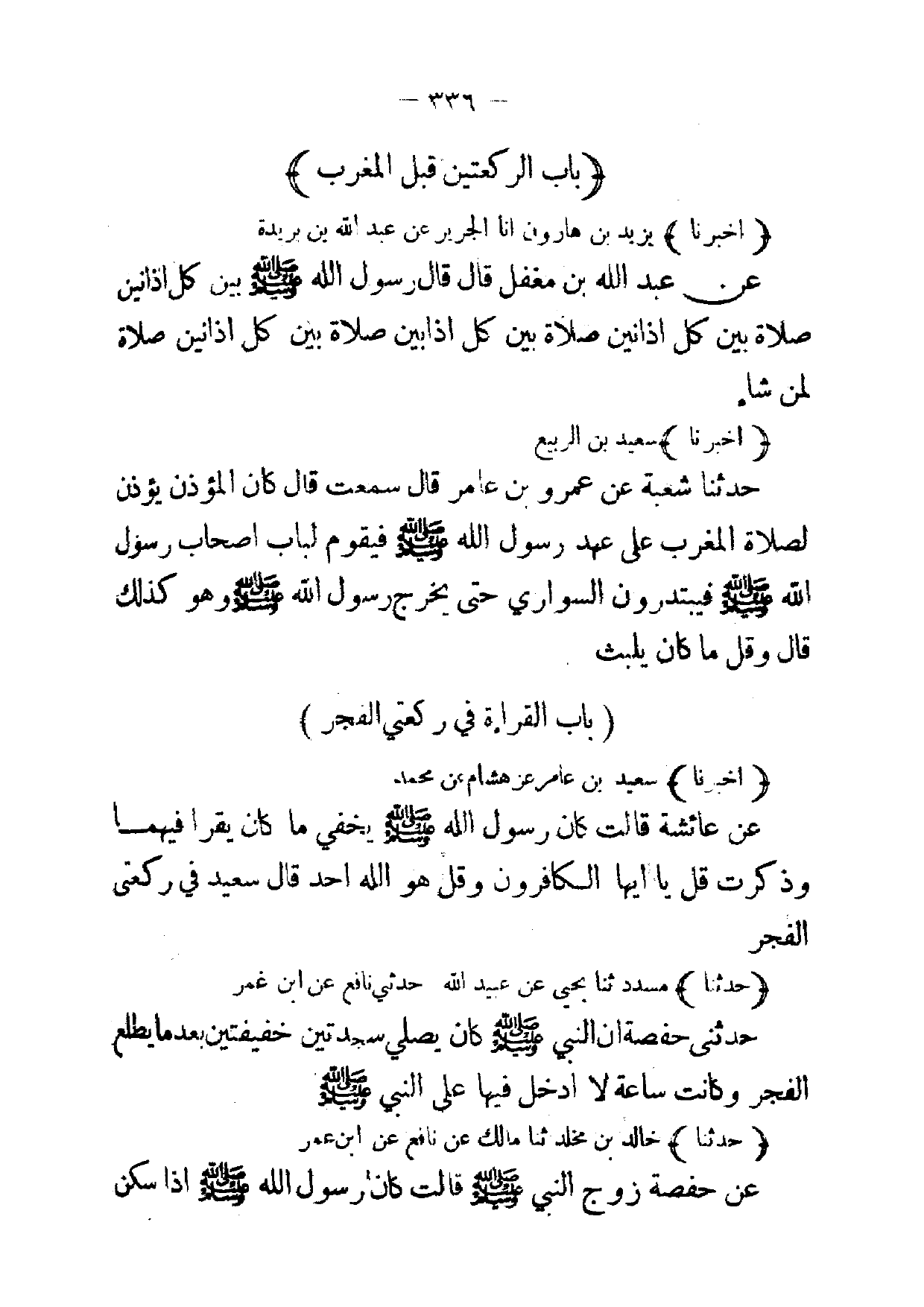 (حدثنا) مسدد ثنا يحيى عن عبيدالله حدثني نافع عن ابن غمر حدثنى حفصة ان النبي صلى الله عليه وسلم كان يصلي سجدتين خفيفتين بعد ما يطلع الفجر وكانت ساعة لا ادخل فيها على النبي صلى الله عليه وسلم