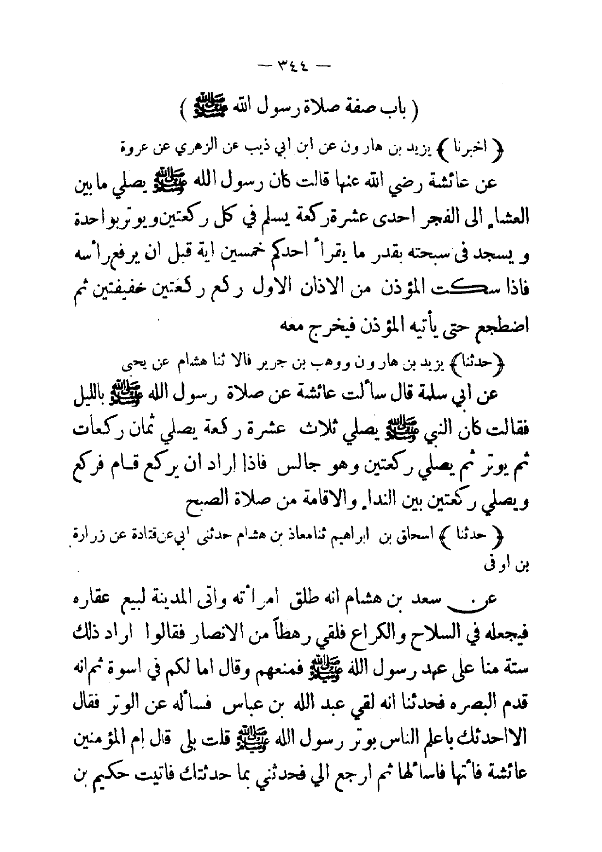 (حدثنا) اسحاق بن ابراهيم ثنا معاذ بن هشام حدثني ابي عن قتادة عن زرارة بن اوفى عن سعد بن هشام انه طلق امرأته واتى المدينة لبيع عقاره فيجعله في السلاح والكراع فلقي رهطا من الانصار فقالوا اراد ذلك ستة منا على عهد رسول الله صلى الله عليه وسلم فمنعهم وقال اما لكم في اسوة ثم انه قدم البصره فحدثنا انه لقي عبد الله بن عباس فسأله عن الوتر فقال الا احدثك با علم الناس بوتر رسول الله صلى الله عليه وسلم قلت بلى قال ام المؤمنين عائشة فأتها فاسألها ثم ارجع الي فحدثني بما حدثتك فاتيت حكيم بن