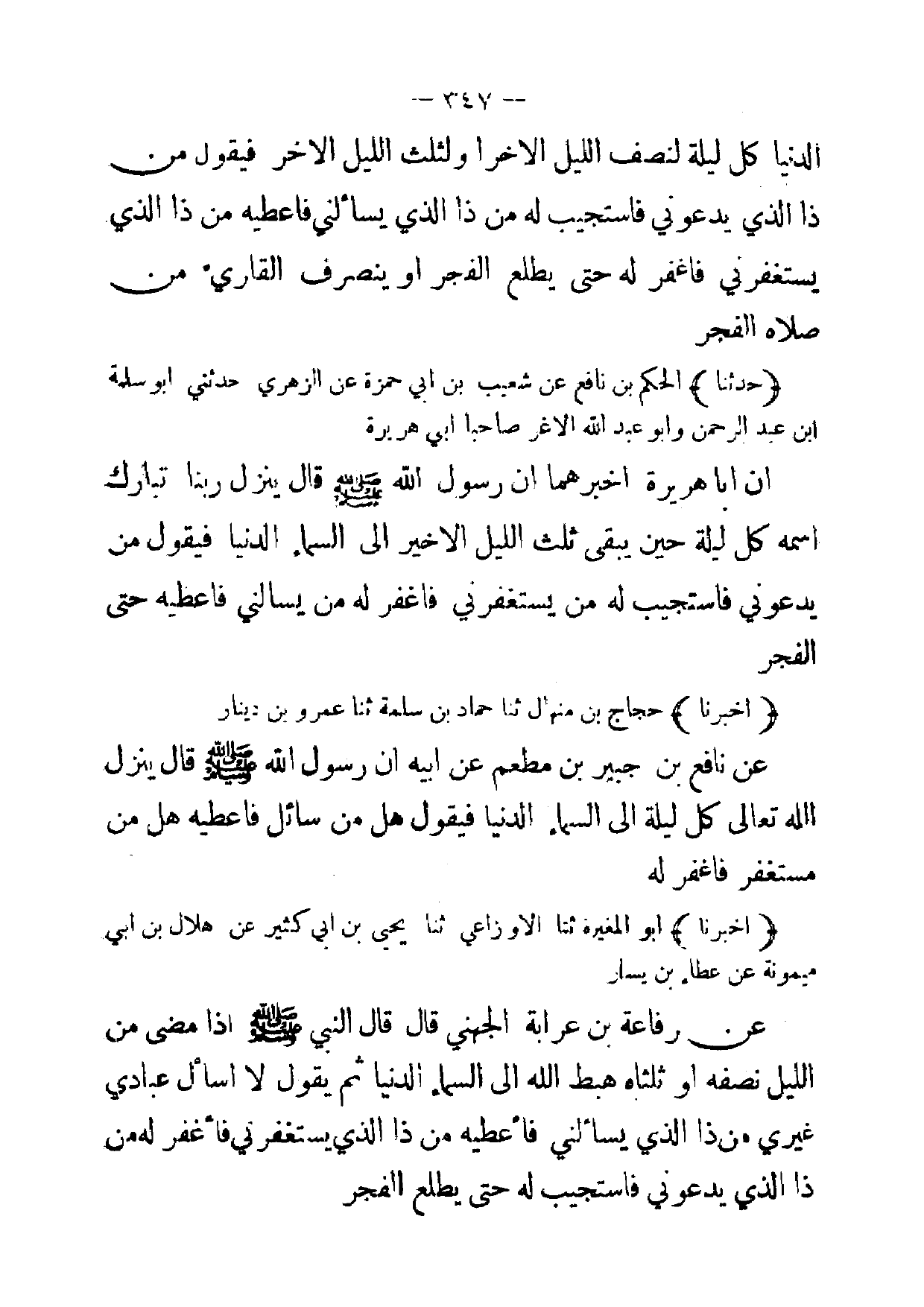 [ 347 ] الدنيا كل ليلة لنصف الليل الاخرا ولثلث الليل الاخر فيقول من ذا الذي يدعوني فاستجيب له من ذا الذي يسألني فاعطيه من ذا الذي يستغفرني فاغفر له حتى يطلع الفجر أو ينصرف فالقارئ من صلاه الفجر