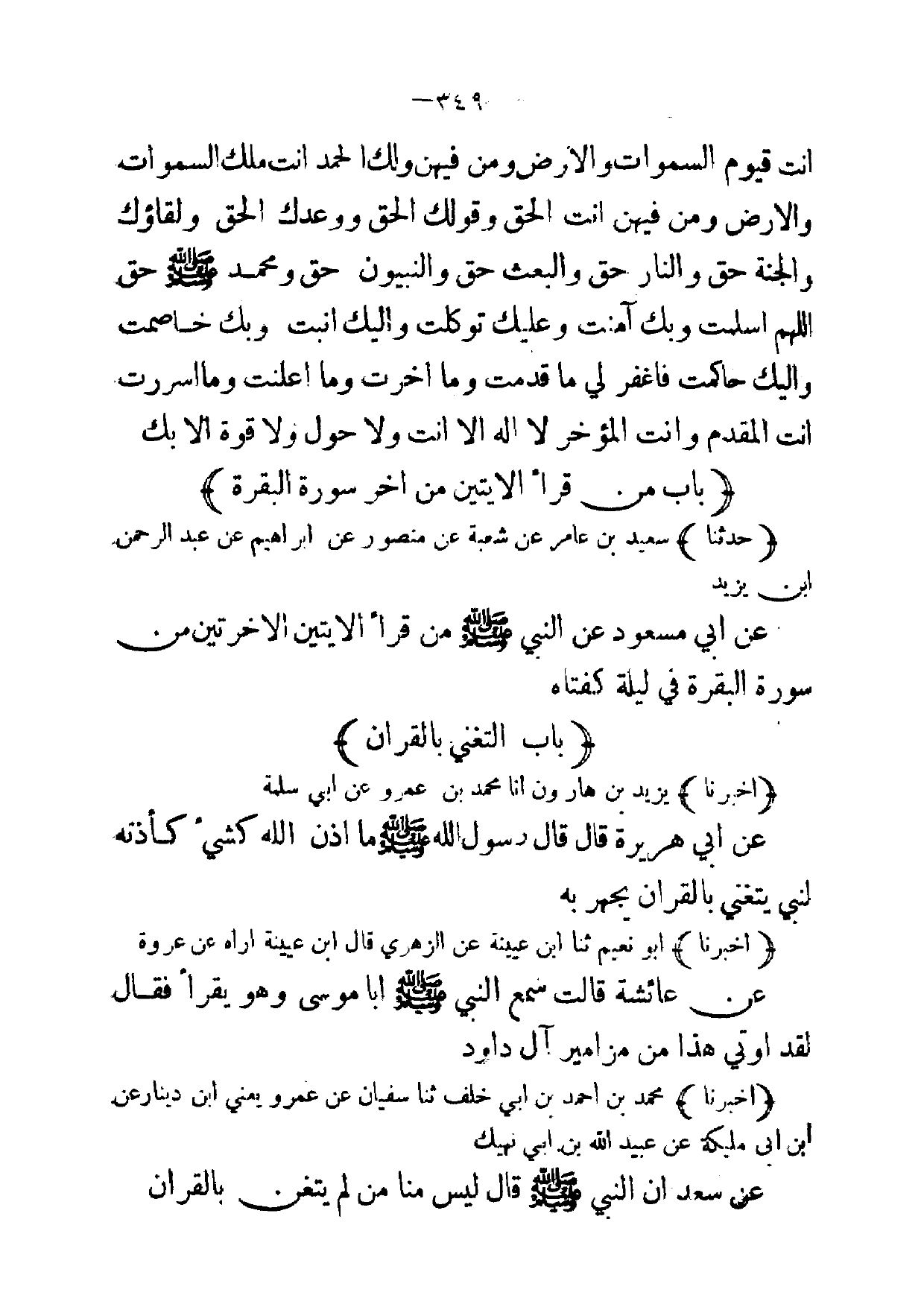 [ 349 ] انت قيوم السموات والارض ومن فيهن ولك الحمد انت ملك السموات والارض ومن فيهن انت الحق وقولك الحق ووعدك الحق ولقاؤك والجنة حق والنار حق والبعث حق والنبيون حق ومحمد صلى الله عليه وسلم حق اللهم اسلمت وبك آمنت وعليك توكلت واليك انبت وبك خاصمت واليك حاكمت فاغفر لي ما قدمت وما اخرت وما اعلنت وما اسررت انت المقدم وانت المؤخر لا اله الا انت ولا حول ولا قوة الا بك