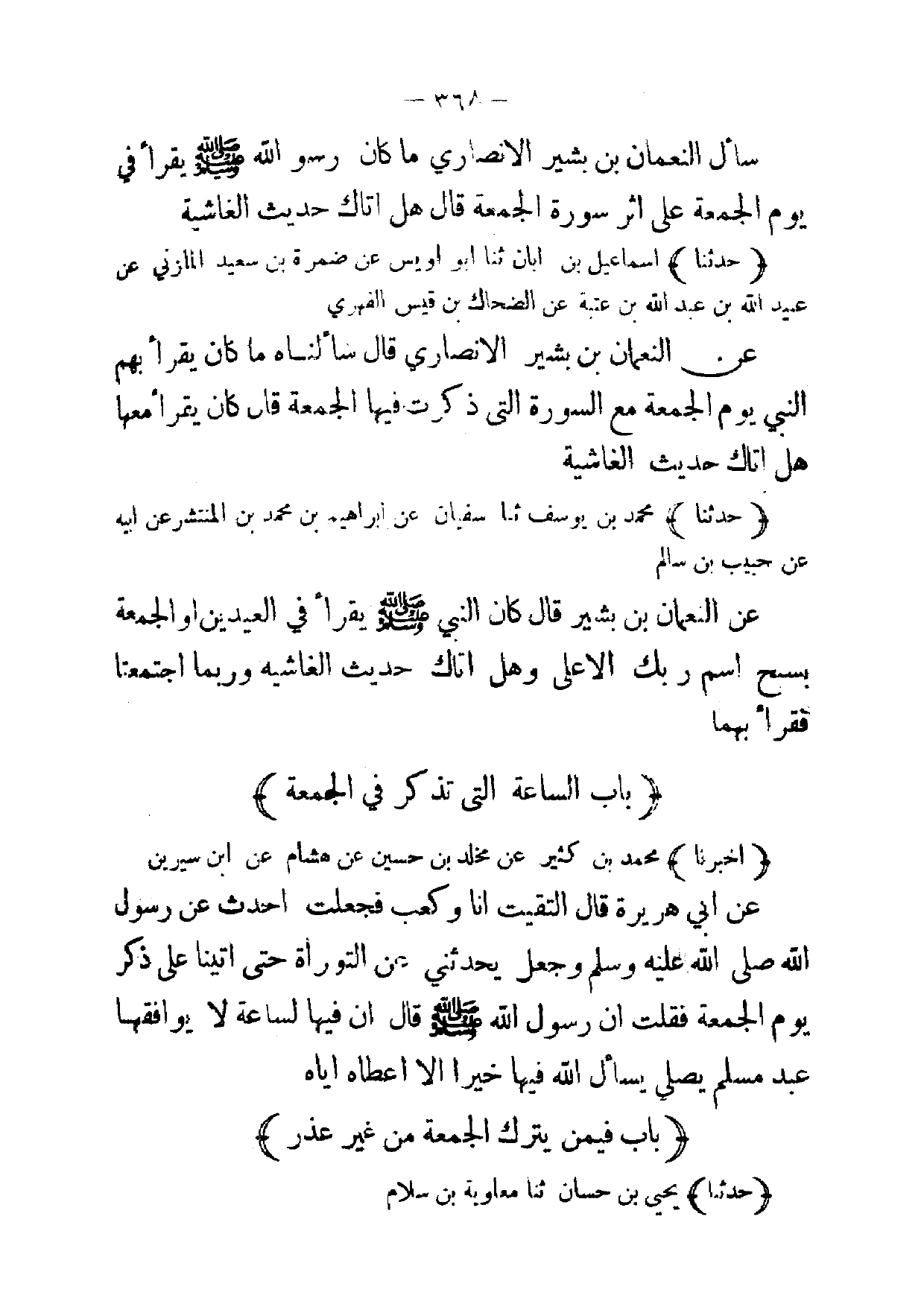[ 368 ] سأل النعمان بن بشير الانصاري ما كان رسول الله صلى الله عليه وسلم يقرأ في يوم الجمعة على اثر سورة الجمعة قال هل اتاك حديث الغاشية
