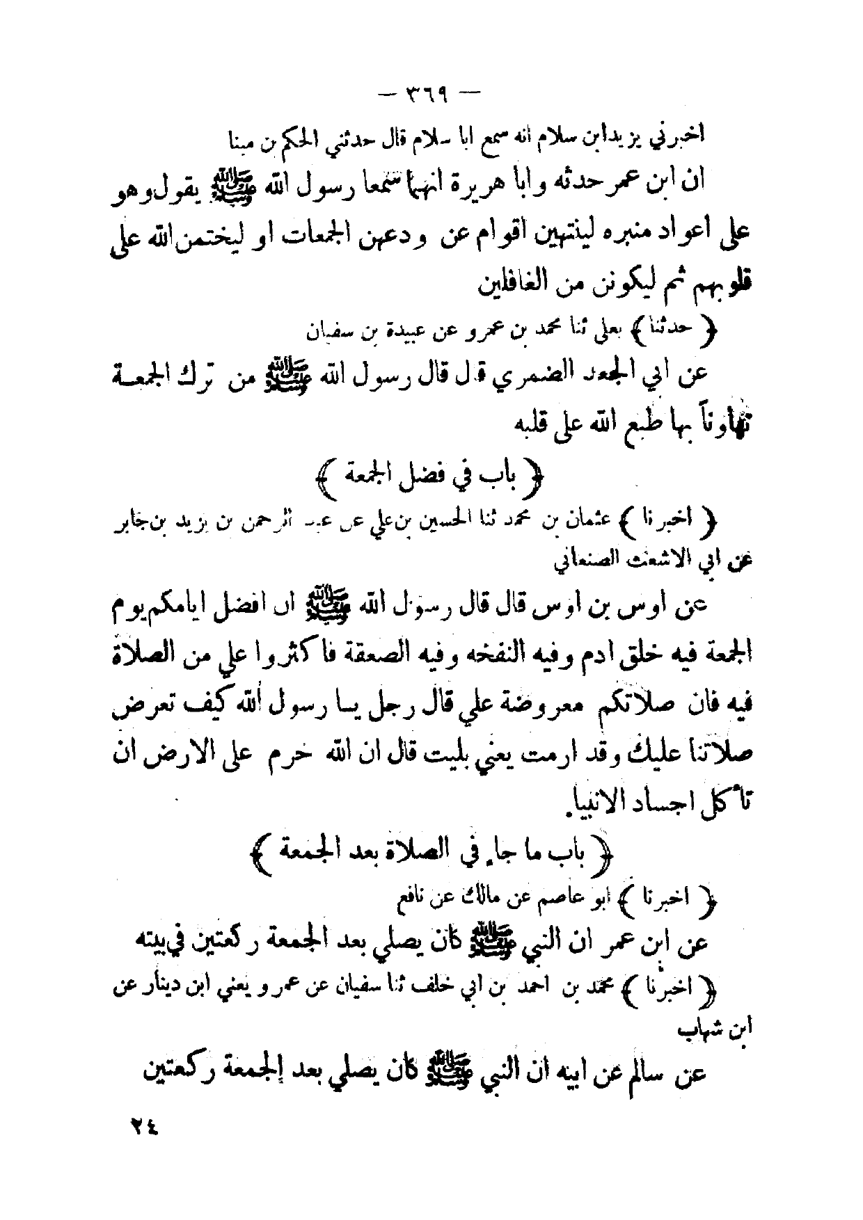 [ 369 ] اخبرني يزيد ابن سلام انه سمع ابا سلام قال حدثني الحكم بن مينا ان ابن عمر حدثه وابا هريرة انهما سمعا رسول الله صلى الله عليه وسلم يقول وهو على اعواد منبره لينتهين اقوام عن ودعهن الجمعات أو ليختمن الله على قلوبهم ثم ليكونن من الغافلين