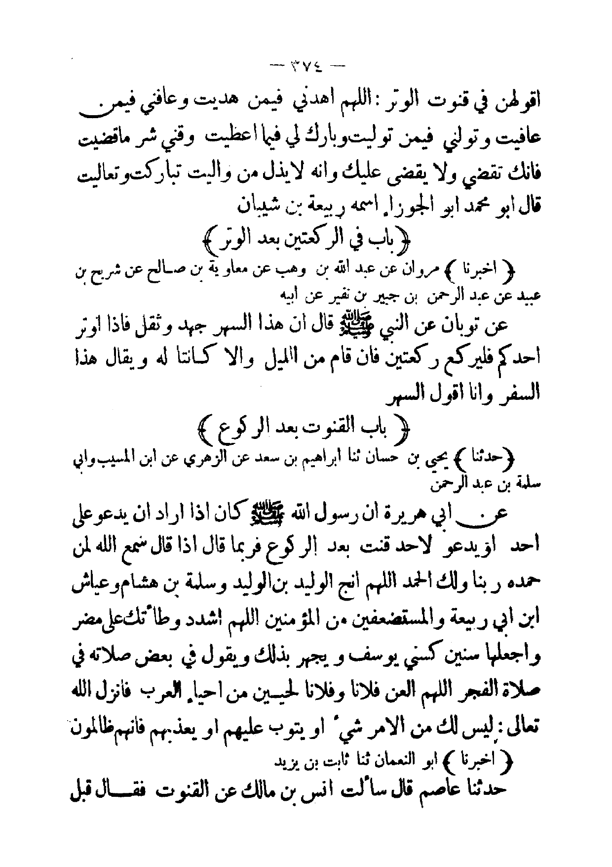 [ 374 ] اقولهن في قنوت الوتر : اللهم اهدني فيمن هديت وعافني فيمن عافيت وتولني فيمن توليت وبارك لي فيما اعطيت وقني شر ما قضيت فانك تقضي ولا يقضى عليك وانه لا يذل من واليت تباركت وتعاليت قال أبو محمد ابو الجوزاء اسمه ربيعة بن شيبان