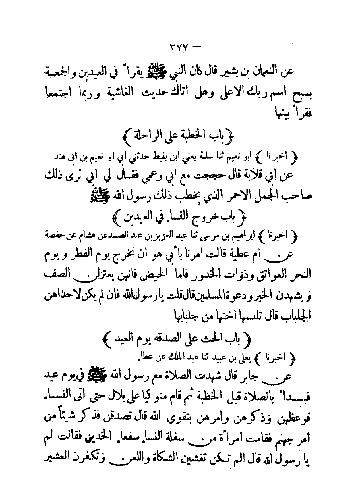 [ 377 ] عن النعمان بن بشير قال كان النبي صلى الله عليه وسلم يقرأ في العيدين والجمعة بسبح اسم ربك الاعلى وهل اتاك حديث الغاشية وربما اجتمعا فقرأ بينها