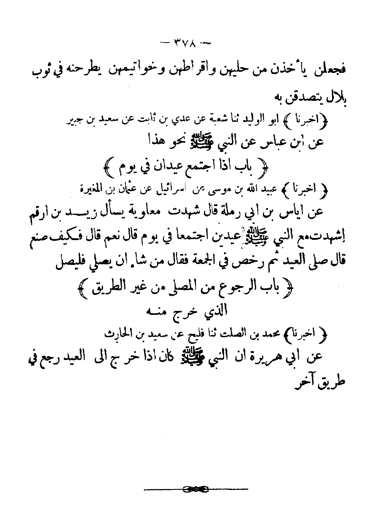 (أخبرنا) محمد بن الصلت ثنا فليح عن سعيد بن الحارث عن ابي هريرة ان النبي صلى الله عليه وسلم كان إذا خرج إلى العيد رجع في طريق آخر