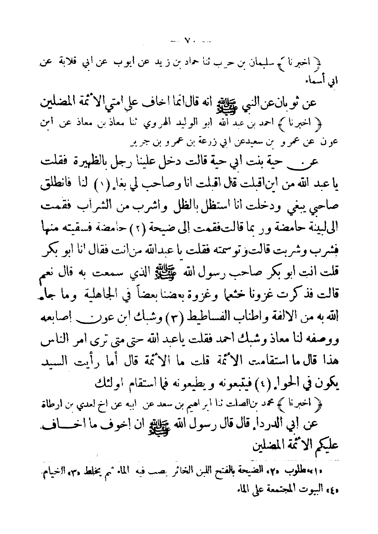 (أخبرنا) احمد بن عبد الله أبو الوليد الهروي ثنا معاذ بن معاذ عن ابن عون عن عمرو بن سعيد عن ابي زرعة بن عمرو بن جرير عن حية بنت ابي حية قالت دخل علينا رجل بالظهيرة فقلت يا عبد الله من اين اقبلت قال اقبلت انا وصاحب لي بغاء (1) لنا فانطلق صاحبي يبغي ودخلت انا استظل بالظل واشرب من الشراب فقمت إلى لبينة حامضة وربما قالت فقمت إلى ضيحة (2) حامضة فسقيته منها فشرب وشربت قالت وتوسمته فقلت يا عبد الله من انت فقال انا أبو بكر قلت انت أبو بكر صاحب رسول الله صلى الله عليه وسلم الذي سمعت به قال نعم قالت فذكرت غزونا خثعما وغزوة بعضنا بعضا في الجاهلية وما جاء الله به من الالفة واطناب الفساطيط (3) وشبك ابن عون أصابعه ووصفه لنا معاذ وشبك احمد فقلت يا عبد الله حتى متى ترى امر الناس هذا قال ما استقامت الائمة قلت ما الائمة قال أما رأيت السيد يكون في الحواء (4) فيتبعونه ويطيعونه فما استقام اولئك