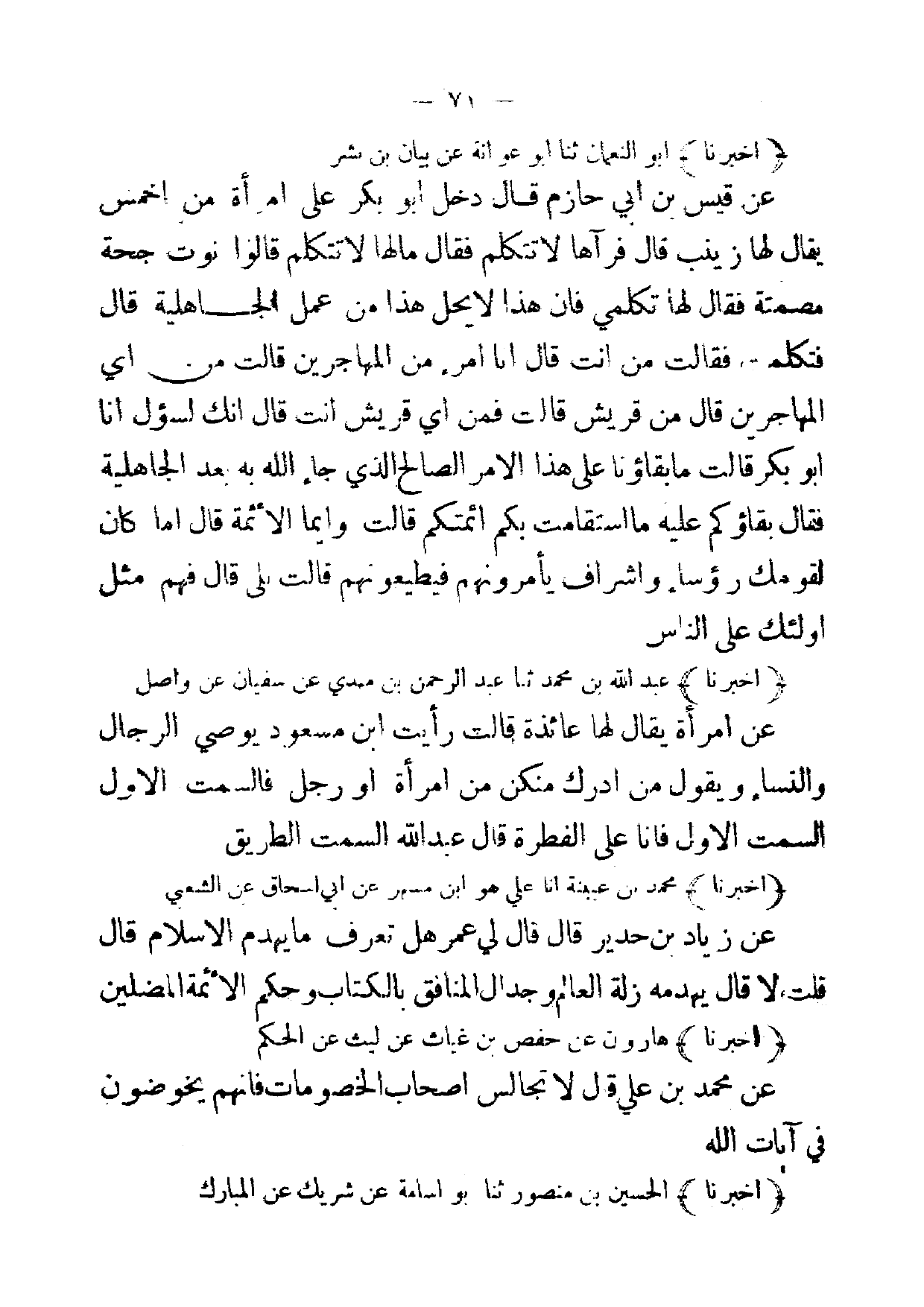 (أخبرنا) عبد الله بن محمد ثنا عبد الرحمن بن مهدي عن سفيان عن واصل عن امرأة يقال لها عائذة قالت رأيت ابن مسعود يوصي الرجال والنساء ويقول من ادرك منكن من امرأة أو رجل فالسمت الاول السمت الاول فانا على الفطرة قال عبد الله السمت الطريق