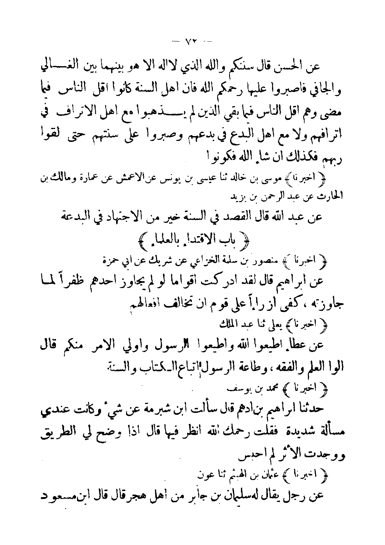 [ 72 ] عن الحسن قال سننكم والله الذي لا اله الا هو بينهما بين الغالي والجافي فاصبروا عليها رحمكم الله فان اهل السنة كانوا اقل الناس فيما مضى وهم اقل الناس فيما بقي الذين لم يذهبوا مع اهل الاتراف في اترافهم ولا مع اهل البدع في بدعهم وصبروا على سنتهم حتى لقوا ربهم فكذلك ان شاء الله فكونوا