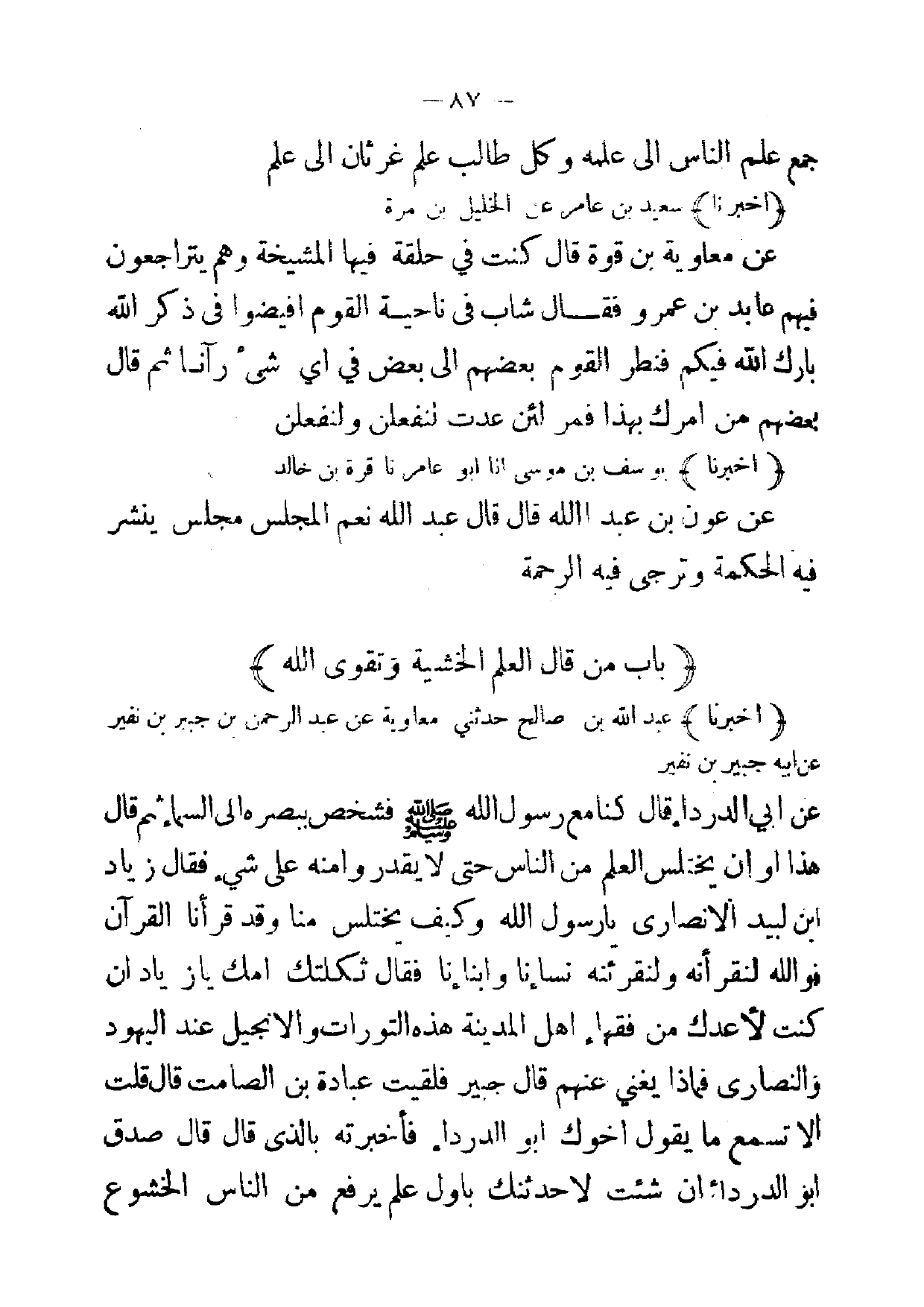 (أخبرنا) عبد الله بن صالح حدثني معاوية عن عبد الرحمن بن جبير بن نفير عن ابيه جبير بن نفير عن ابي الدرداء قال كنامع رسول الله صلى الله عليه وسلم فشخص ببصره إلى السماء ثم قال هذا اوان يختلس العلم من الناس حتى لا يقدروا منه على شئ فقال زياد ابن لبيد الانصاري يا رسول الله وكيف يختلس منا وقد قرأنا القرآن فوالله لنقرأنه ولنقرئنه نساءنا وابناءنا فقال ثكلتك امك يا زياد ان كنت لاعدك من فقهاء اهل المدينة هذه التورات والانجيل عند اليهود والنصارى فماذا يغني عنهم قال جبير فلقيت عبادة بن الصامت قال قلت الا تسمع ما يقول اخوك أبو الدرداء فأخبرته بالذى قال قال صدق ابو الدرداء ان شئت لا حدثنك باول علم يرفع من الناس الخشوع