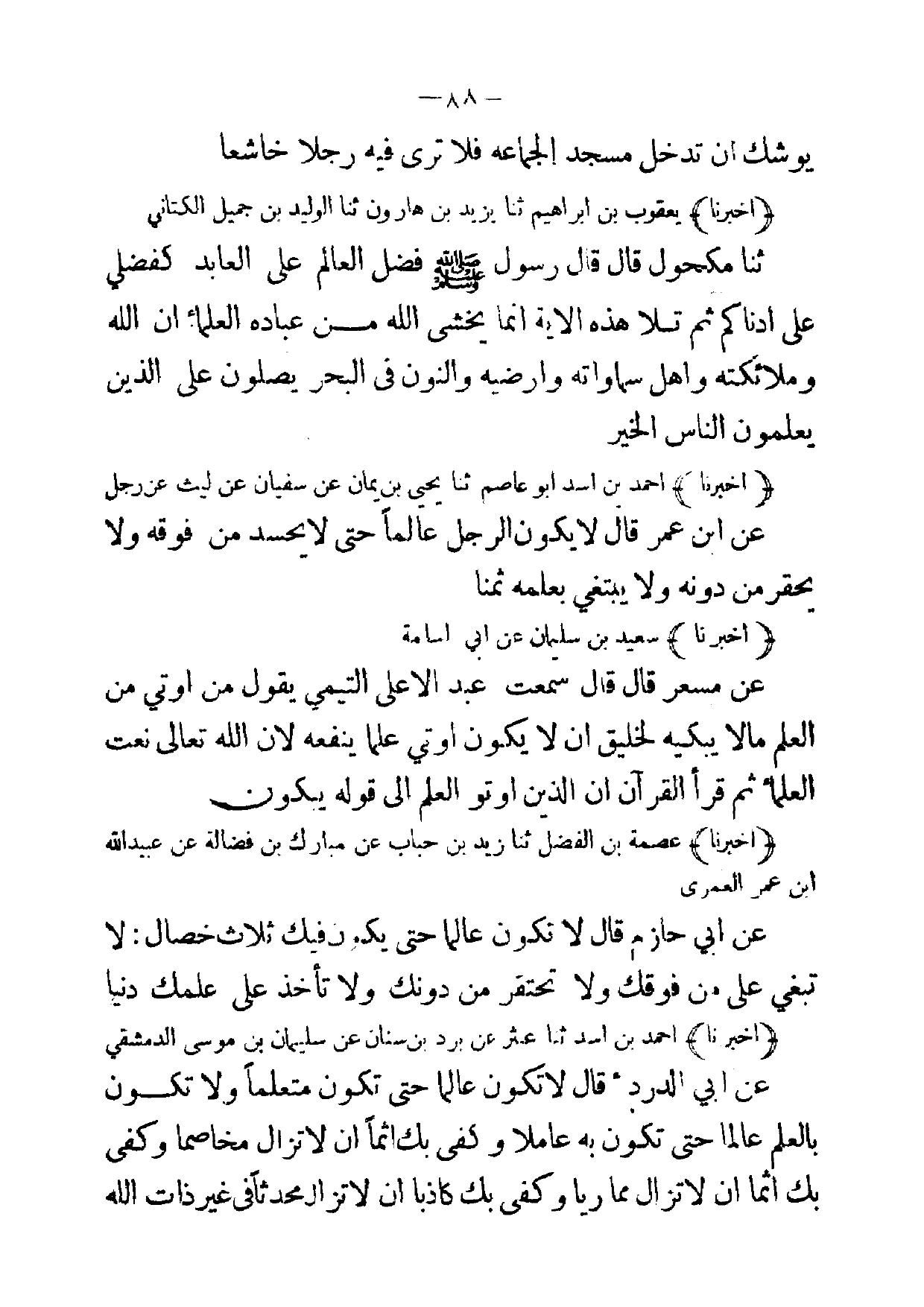 (أخبرنا) احمد بن اسد أبو عاصم ثنا يحيى بن يمان عن سفيان عن ليث عن رجل عن ابن عمر قال لا يكون الرجل عالما حتى لا يحسد من فوقه ولا يحقر من دونه ولا يبتغي بعلمه ثمنا