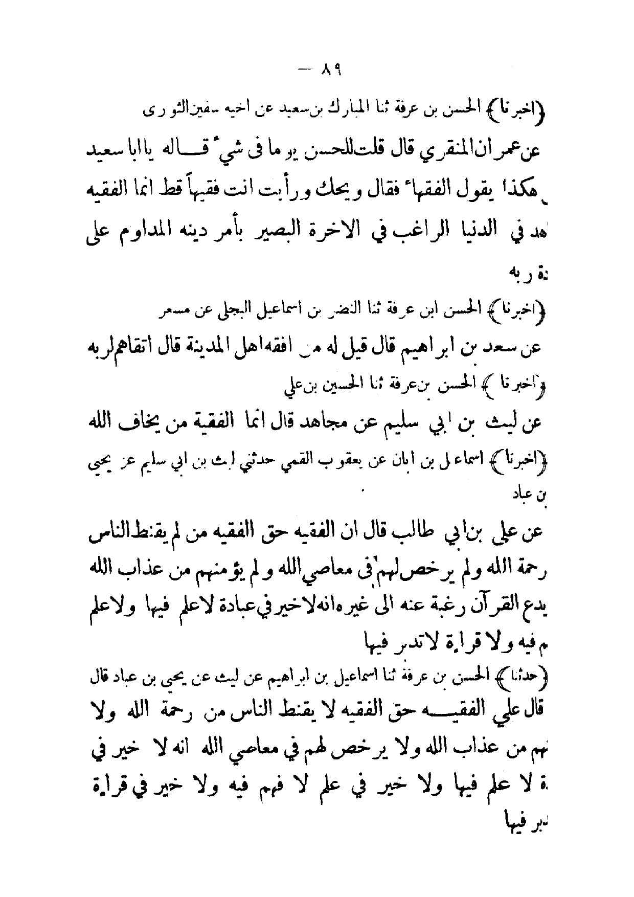 (أخبرنا) الحسن بن عرفة ثنا المبارك بن سعيد عن اخيه سفين الثوري عن عمران المنقري قال قلت للحسن يوما في شئ قاله يا ابا سعيد ليس هكذا يقول الفقهاء فقال ويحك ورأيت انت فقيها قط انما الفقيه الزاهد في الدنيا الراغب في الاخرة البصير بأمر دينه المداوم على عبادة ربه
