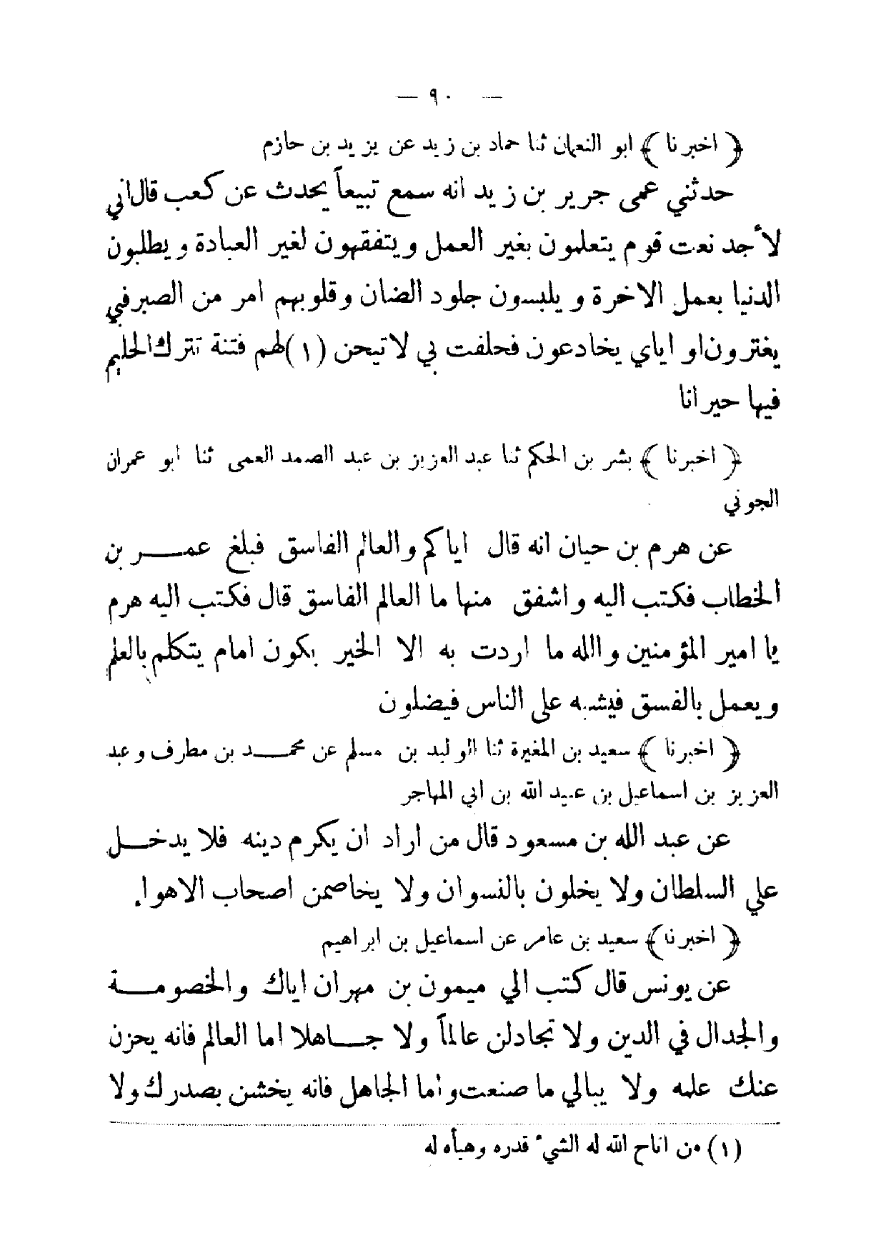 (أخبرنا) سعيد بن المغيرة ثنا الوليد بن مسلم عن محمد بن مطرف وعبد العزيز بن اسماعيل بن عبيدالله بن ابي المهاجر عن عبد الله بن مسعود قال من اراد ان يكرم دينه فلا يدخل علي السلطان ولا يخلون بالنسوان ولا يخاصمن اصحاب الاهواء
