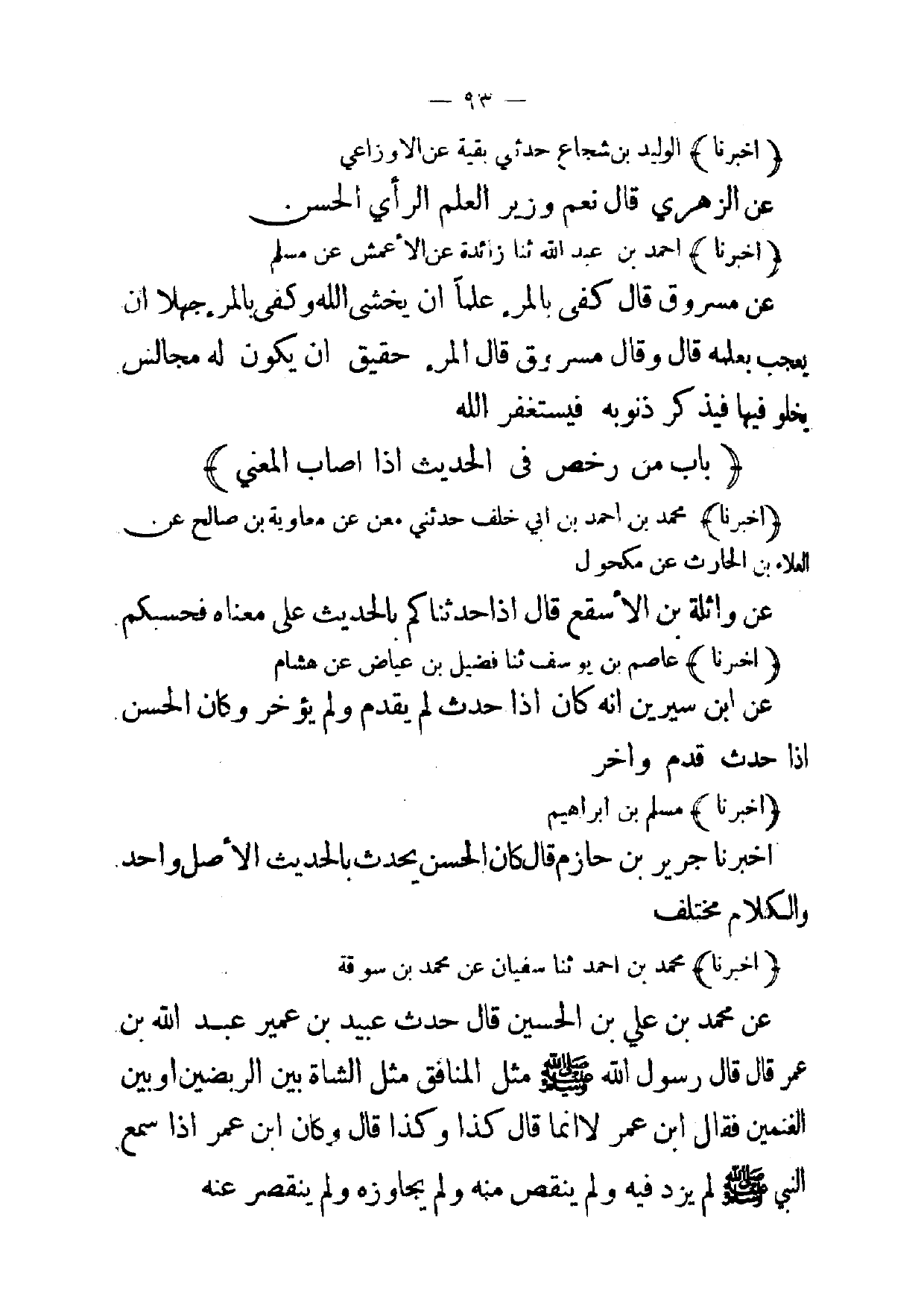 (أخبرنا) عاصم بن يوسف ثنا فضيل بن عياض عن هشام عن ابن سيرين انه كان إذا حدث لم يقدم ولم يؤخر وكان الحسن إذا حدث قدم واخر