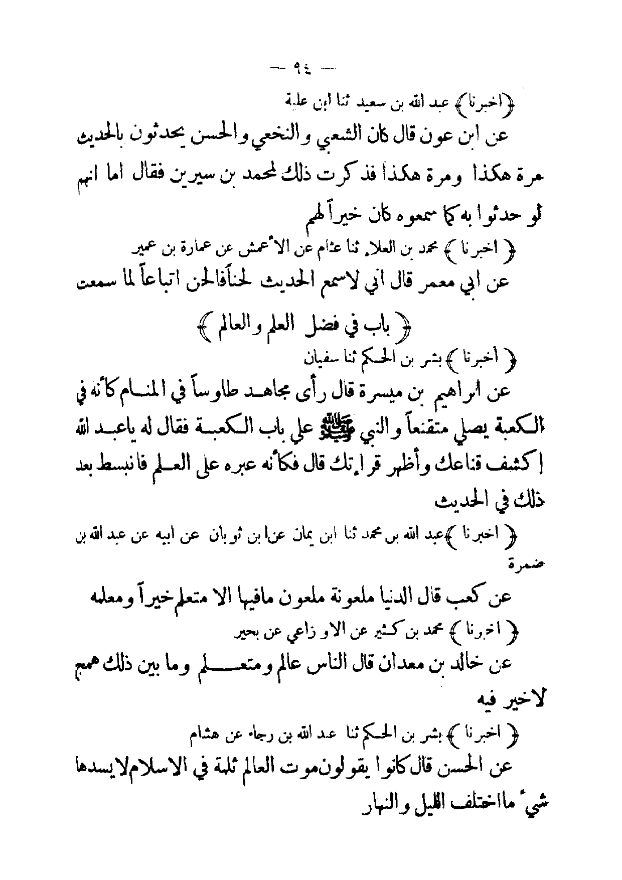 (أخبرنا) بشر بن الحكم ثنا عبد الله بن رجاء عن هشام عن الحسن قال كانوا يقولون موت العالم ثلمة في الاسلام لا يسدها شئ ما اختلف الليل والنهار