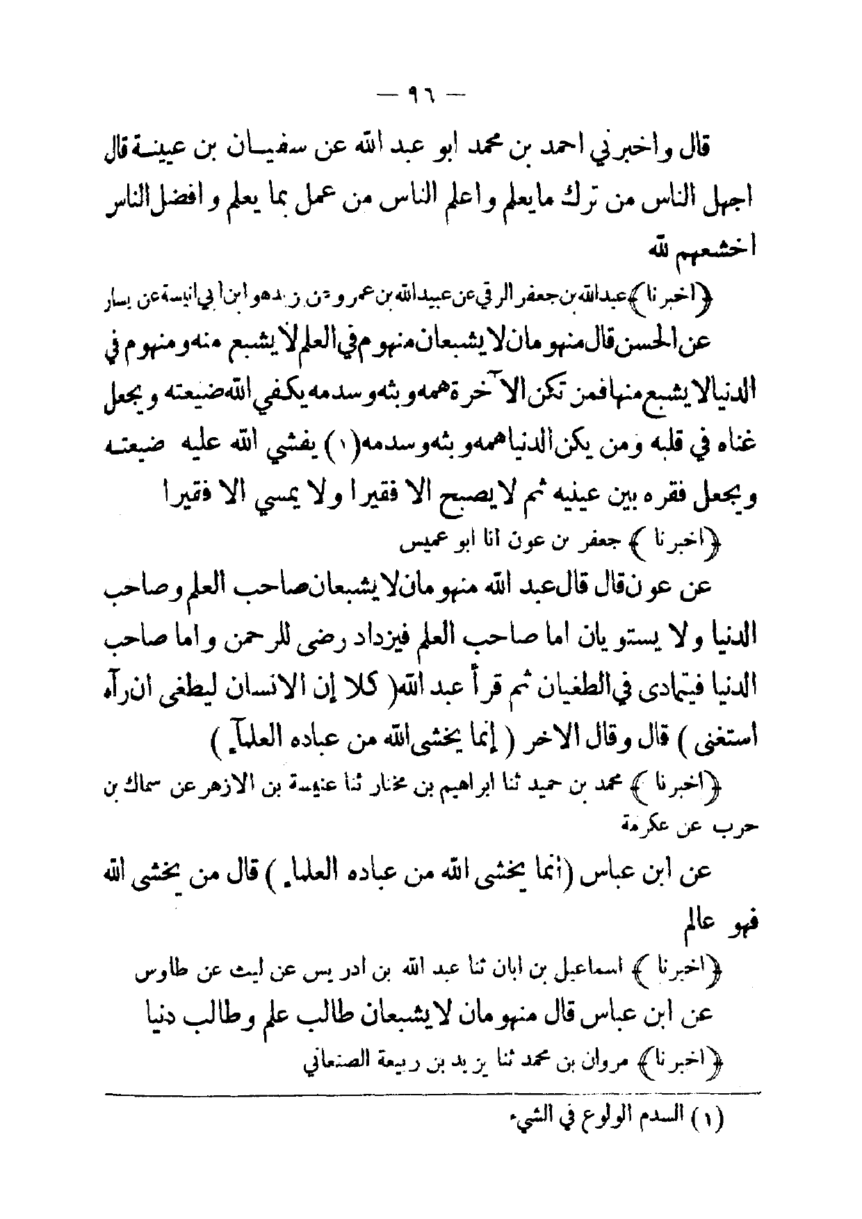 (أخبرنا) جعفر بن عون انا أبو عميس عن عون قال قال عبد الله منهومان لا يشبعان صاحب العلم وصاحب الدنيا ولا يستويان اما صاحب العلم فيزداد رضى للرحمن واما صاحب الدنيا فيتمادى في الطغيان ثم قرأ عبد الله (كلا إن الانسان ليطغى ان رآه استغنى) قال وقال الاخر (إنما يخشى الله من عباده العلماء)