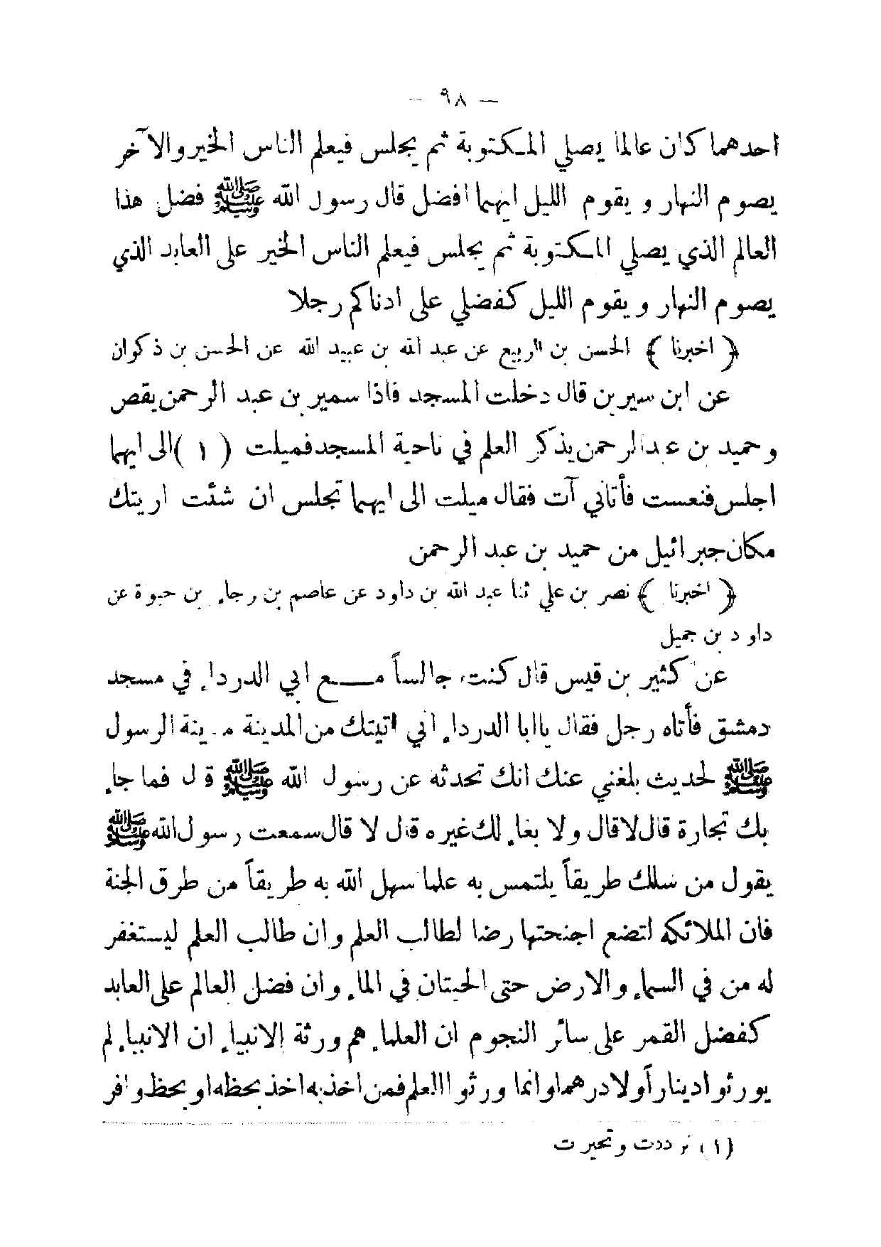 (أخبرنا) نصر بن علي ثنا عبد الله بن داود عن عاصم بن رجاء بن حيوة عن داود بن جميل عن كثير بن قيس قال كنت ، جالسا مع ابي الدرداء في مسجد دمشق فأتاه رجل فقال يا ابا الدرداء اني اتيتك من المدينة مدينة الرسول صلى الله عليه وسلم لحديث بلغني عنك انك تحدثه عن رسول الله صلى الله عليه وسلم قال فما جاء بك تجارة قال لا قال ولا بغاء لك غيره قال لا قال سمعت رسول الله صلى الله عليه وسلم يقول سلك طريقا يلتمس به علما سهل الله به طريقا من طرق الجنة فان الملائكة لتضع اجنحتها رضا لطالب العلم وان طالب العلم ليستغفر له من في السماء والارض حتى الحيتان في الماء و ان فضل العالم على العابد كفضل القمر على سائر النجوم ان العلماء هم ورثة الانبياء ان الانبياء لم يورثوا دينارا ولا درهما وانما ورثوا العلم فمن اخذ به اخذ بحظه أو بحظ وافر