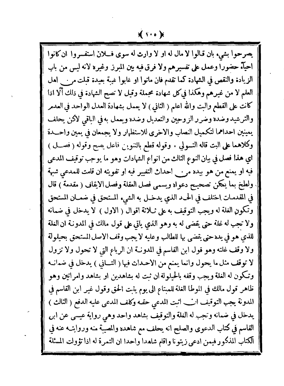 يصرحوا بشيء بأن قالوا لا مال له ولا وارث له سوى فلان استفسروا أن كانوا أحياء حضورًا وعمل على تفسيرهم ولا فرق فيه بين المبرز وغيره لأنه ليس من باب الزيادة والنقص في الشهادة كما تقدم فإن ماتوا أو غابوا غيبة بعيدة قبلت من أهل العلم لا من غيرهم وهكذا في كل شهادة مجملة وقيل لا تصح الشهادة في ذلك إلا إذا كانت على القطع والبت والله أعلم (الثاني) لا يعمل بشهادة العدل الواحد في العدم والترشيد وضده وضرر الزوجين والتعديل ضده ويعمل به في الباقي لكن يحلف يمينين إحداهما لتكميل النصاب والأخرى للاستظهار ولا يجمعان في يمين واحدة وكلاهما على البت قاله التسولي. وقوله قطع بالتنوين فاعل يصح وقوله (فصل) أي هذا فصل في بيان النوع الثالث من أنواع الشهادات وهو ما يوجب توقيف المدعي فيه أو يمنع من هو بيده من إحداث التغيير فيه أو تفويته أن قامت للمدعي شبهة ولطخ بما يمكن تصحيح دعواه ويسمى فصل العقلة وفصل الإيقاف (مقدمة) قال في المقدمات ختلف في الحد الذي يدخل به الشيء المستحق في ضمان المستحق وتكون الغلة له ويجب التوقيف به على ثلاثة أقوال (الأول) لا يدخل في ضمانه ولا تجب له غلة حتى يقضى له به وهو الذي يأتي على قول مالك في المدونة أن الغلة للذي هو في يده حتى يقضى بها للطالب وعليه لا يجب وقف الأصل المستحق بحيلولة ولا وقف غلته وهو قول ابن القاسم في المدونة أن الرباع التي لا تحول ولا تزول لا توقف مثل ما يحول وإنما يمنع من الأحداث فيها (الثاني) يدخل في ضمانه وتكون له الغلة ويجب وقفه بالحيلولة أن ثبت له بشاهدين أو بشاهد وامرأتين وهو ظاهر قول مالك في الموطأ الغلة للمبتاع إلى يوم يثبت الحق وقول غير ابن القاسم في المدونة يجب التوقيف أن أثبت المدعي حقه وكلف المدعى عليه الدفع (الثالث) يدخل في ضمانه وتجب له الغلة والتوقيف بشاهد واحد وهي رواية عيسى عن أبي القاسم في كتاب الدعوى والصلح أنه يحلف مع شاهده والمصيبة منه وروايته عنه في الكتاب المذكور فيمن ادعى زيتونًا وأقام شاهدًا واحدًا أن الثمرة له إذ تؤولت المسئلة