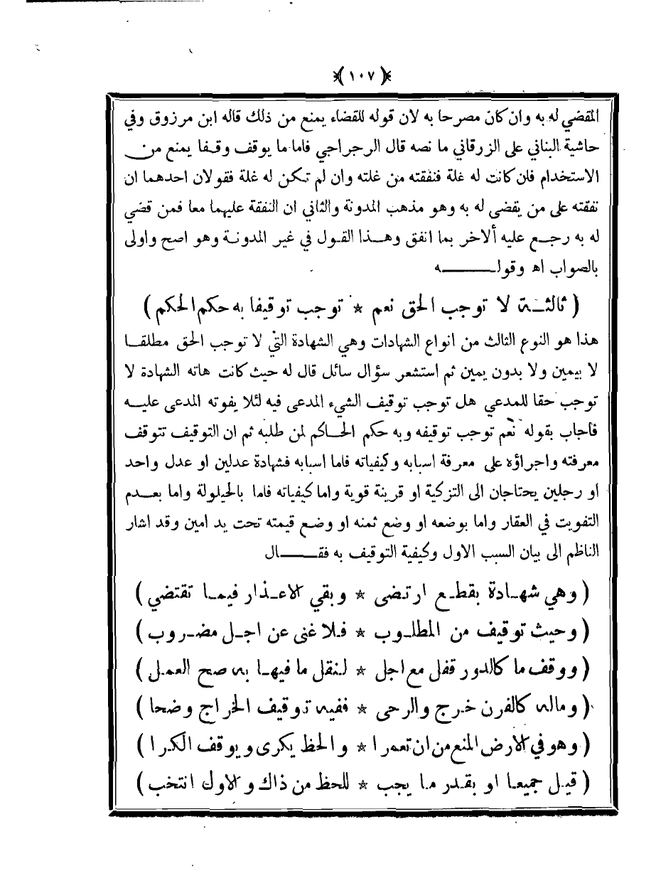 هذا هو النوع الثالث من أنواع الشهادات وهي الشهادة التي لا توجب الحق مطلقًا لا بيمين ولا بدون يمين ثم استشعر سؤال سائل قال له حيث كانت هاته الشهادة لا توجب حقًا للمدعي هل توجب توقيف الشيء المدعى فيه لئلا يفوته المدعى عليه فأجاب بقوله نعم توجب توقيفه وبه حكم الحاكم لمن طلبه ثم أن التوقيف تتوقف معرفته وإجراؤه على معرفة أسبابه وكيفياته فأما أسبابه فشهادة عدلين أو عدل واحد أو رجلين يحتاجان إلى التزكية أو قرينة قوية وأما كيفياته فإما بالحيلولة وإما بعدم التفويت في العقار وإما بوضعه أو وضع ثمنه أو وضع قيمته تحت يد أمين وقد أشار الناظم إلى بيان السبب الأول وكيفية التوقيف به فقال