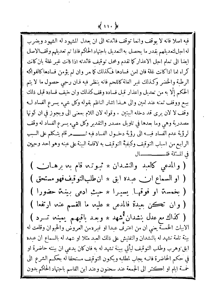 الأبيات الخمسة يعني أن من اعترف عبدًا أو غيره من العروض والحيوان وقامت له بينة تامة تشهد له بالنشدان والتفتيش على ذلك العبد مثلًا أو شهد له بالسماع أن عبده آبق وهرب وطلب التوقيف ليأتي ببينة تشهد له به فإن كان يدعي أن بينته حاضرة أو في حكم الحاضرة فإنه يجاب لمطلبه ويكون التوقيف مستحقًا له بحكم الشرع إلى خمسة أيام أو أكثر إلى الجمعة عند سحنون وعند ابن القاسم باجتهاد الحاكم بدون