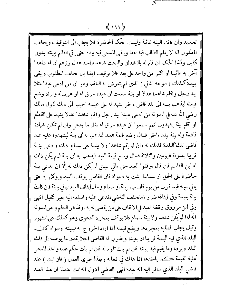 تحديد وإن كانت البينة غائبة وليست بحكم الحاضرة فلا يجاب إلى التوقيف ويحلف المطلوب أنه لا يعلم للطالب فيه حقًا ويبقى المدعى فيه بيده حتى يأتي القائم ببينته بدون كفيل وكذا الحكم أن قام له بالنشدان والبحث شاهد واحد عدل وزعم أن له شاهدًا آخر به غائبًا أو أكثر من واحد على بعد فلا توقيف أيضا بل يحلف المطلوب ويبقى بيده كذلك (الوجه الثاني) الذي لميتعرض له الناظم وهو أن من ادعى عبدًا مثلًا بيدرجل وأقام شاهدًا عدلًا أو بينة سمعت أن عبده سرق له أو هرب له وأراد وضع قيمته ليذهب به إلى بلد قاض آخر يهد له على عينه أجيب إلى ذلك لقول مالك رضي الله عنه في المدونة من ادعى عبدًا بيد رجل وأقام شاهدًا عدلًا يشهد على القطع أو أقام بينة يشهدون أنهم سمعوا أن عبده سرق له مثل ما يدعي وإن لم تكن شهادة قاطعة وله بينة ببلد آخر فسأل وضع قيمة العبد ليذهب به إلى بينة ليشهدوا عليه عند قاضي تلك البلدة فذلك له وإن لم يقم شاهدًا ولا بينة على سماع ذلك وادعى بينة قريبة بمنزلة اليومين والثلاثة فسأل وضع قيمة العبد ليذهب به إلى بينة لم يكن ذلك له ابن القاسم فإن قال أوقفوا العبد حتى آتي ببينتي لم يكن ذلك له إلا أن يدعي بينة حاضرة على الحق أو سماعًا يثبت به دعواه فإن القاضي يوقف العبد ويوكل به حتى يأتي ببينة فيما قرب من يوم فإن جاء ببينة أو سماع وسأل إيقاف العبد ليأتي ببينة فإن كانت بينة بعيدة وفي إيقافه ضرر استحلف القاضي المدعى عليه وأسلمه إليه بغير كفيل انتهى وفي ابن مرزوق ونفقة العبد في الإيقاف على من يقضي له به. وظاهر النظم ونص المدونة أنه إذا لم يكن شاهد ولا بينة سماع فلا يوقف بمجرد الدعوى وهو كذلك على المشهور وقيل يجاب لمطلبه بمجردها ويضع قيمته إذا أراد الخروج به لبينته وسواء كان البلد الذي فيه البينة قريبًا أو بعيدًا ويضرب له القاضي أجلًا بقدر ما يوصله إلى ذلك البلد ويرده وما يقيم فيه بينته فإن لم يأت تلوم لهفإن لم يأت حكم عليه وأخذ المدعى عليه القيمة كما يأخذها إذا هلك في ذهابه وبهذا جرى العمل (فإن ثبت) عند قاضي البلد الذي سافر إليه أنه عبده أنهى للقاضي الأول أنه ثبت عندنا أن هذا العبد