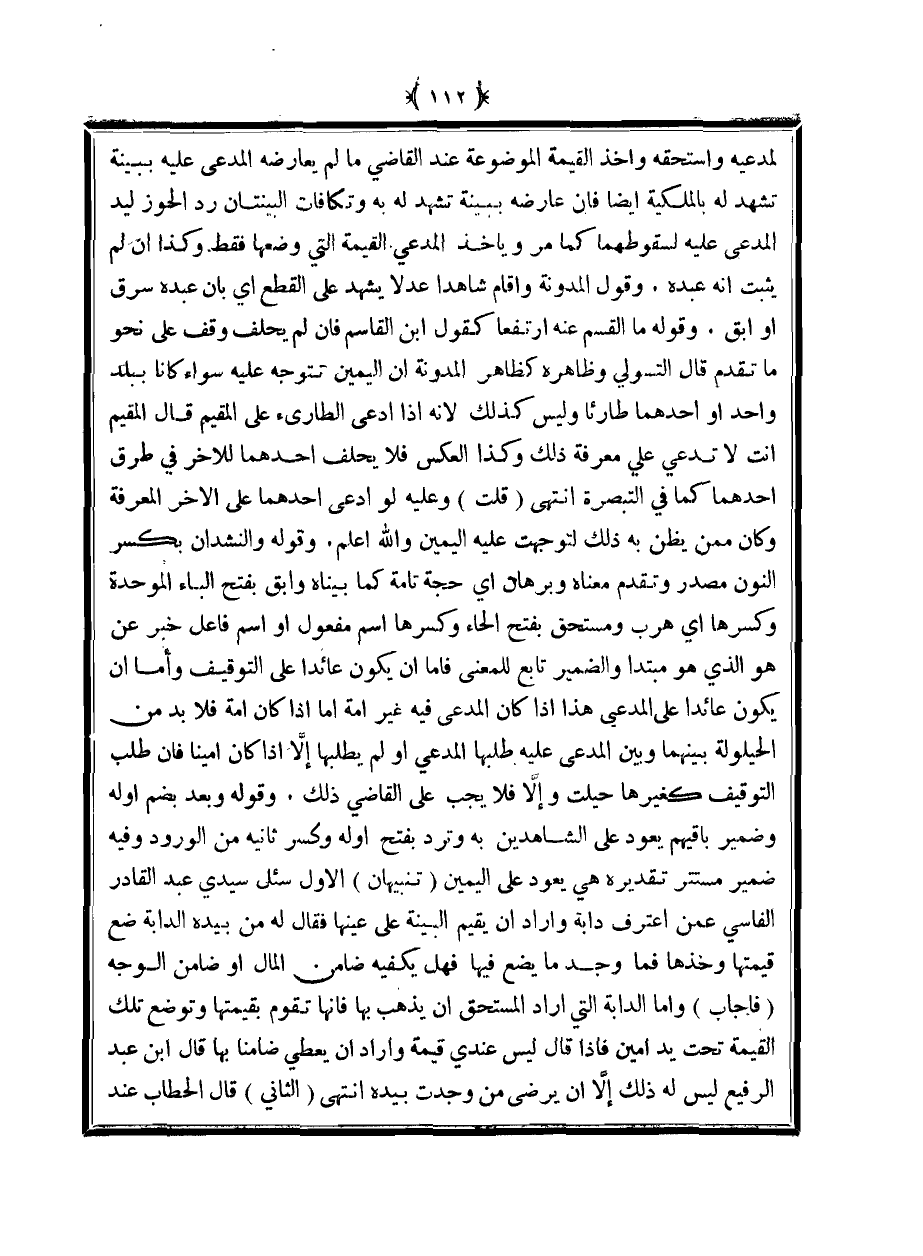 لمدعيه واستحقه وأخذ القيمة الموضوعة عند القاضي ما لم يعارضه المدعى عليه ببينة تشهد له بالملكية أيضا فإن عارضه ببينة تشهد له به وتكافت البينتان رد الحوز ليد المدعى عليه لسقوطهما كما مر ويأخذ المدعي القيمة التي وضعها فقط. وكذا أن لم يثبت أنه عبده. وقول المدونة وأقام شاهدًا عدلًا يشهد على القطع أي بأن عبده سرق أو آبق. وقوله ما القسم عنه ارتفعا كقول ابن القاسم فإن لم يحلف وقف على نحو ما تقدم قال التسولي وظاهره كظاهر المدونة أن اليمين تتوجه عليه سواء كانا ببلد واحد أو أحدهما طارئًا وليس كذلك لأنه إذا ادعى الطارئ على المقيم قال المقيم أنت لا تدعي علي معرفة ذلك وكذا العكس فلا يحلف أحدهما للآخر في طرق أحدهما كما في التبصرة انتهى (قلت) وعليه لو ادعى أحدهما على الآخر المعرفة وكان ممن يظن به ذلك لتوجهت عليه اليمين والله أعلم. وقوله والنشدان بكسر النون مصدر وتقدم معناه وبرهان أي حجة تامة كما بيناه وآبق بفتح الباء الموحدة وكسرها أي هرب ومستحق بفتح الحاء وكسرها اسم مفعول أو اسم فاعل خبر عن هو الذي هو مبتدأ والضمير تابع للمعنى فإما أن يكون عائدًا على التوقيف وأما أن يكون عائدًا على المدعي هذا إذا كان المدعى فيه غير أمة أما إذا كان أمة فلا بد من الحيلولة بينهما وبين المدعى عليه طلبها المدعي أو لم يطلبها إلا إذا كان أمينًا فإن طلب التوقيف كغيرها حيلت وإلا فلا يجب على القاضي ذلك. وقوله وبعد بضم أوله وضمير باقيهم يعود على الشاهدين به وترد بفتح أوله وكسر ثانيه من الورود وفيه ضمير مستتر تقديره هي يعود على اليمين (تنبيهان) الأول سئل سيدي عبد القادر الفاسي عمن اعترف دابة وأراد أن يقيم البينة على عينها فقال له من بيده الدابة ضع قيمتها وخذها فما وجد ما يضع فيها فهل يكفيه ضامن المال أو ضامن الوجه (فأجاب) وأما الدابة التي أراد المستحق أن يذهب بها فإنها تقوم بقيمتها وتوضع تلك القيمة تحت يد أمين فإذا قال ليس عندي قيمة وأراد أن يعطي ضامنًا بها قال ابن عبد الرفيع ليس له ذلك إلا أن يرضى من وجدت بيده انتهى (الثاني) قال الحطاب عند
