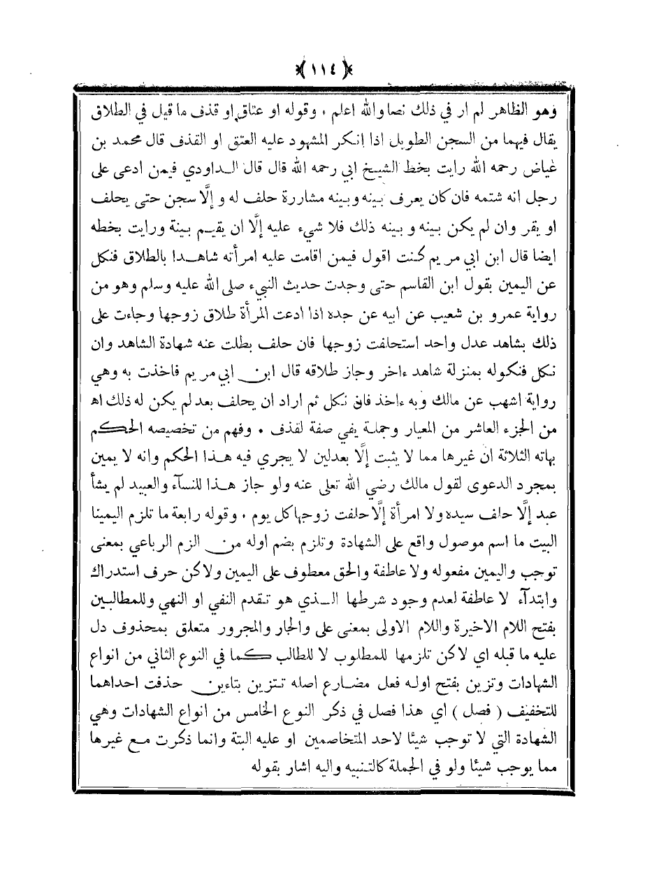وهو الظاهر لم أر في ذلك نصًا والله أعلم. وقوله أو عتاق أو قذف ما قيل في الطلاق يقال فيهما من السجن الطويل إذا أنكر المشهود عليه العتق أو القذف قال محمد بن عياض رحمه الله رأيت بخط الشيخ أبي رحمه الله قال قال الداودي فيمن ادعى على رجل أنه شتمه فإن كان يعرف بينه وبينه مشاررة حلف له وإلا سجن حتى يحلف أو يقرر وإن لم يكن بينه وبينه ذلك فلا شيء عليه إلا أن يقيم بينة ورأيت بخطه أيضا قال ابن أبي مريم كنت أقول فيمن أقامت عليه امرأته شاهدًا بالطلاق فنكل عن اليمين بقول ابن القاسم حتى وجدت حديث النبي صلى الله عليه وسلم وهو من رواية عمرو بن شعيب عن أبيه عن جده إذا ادعت المرأة طلاق زوجها وجاءت على ذلك بشاهد عدل واحد استحلفت زوجها فإن حلف بطلت عنه شهادة الشاهد وإن نكل فنكوله بمنزلة شاهد آخر وجاز طلاقه قال ابن أبي مريم فأخذت به وهي رواية أشهب عن مالك وبه آخذ فإن نكل ثم أراد أن يحلف بعد لم يكن له ذلك اهـ من الجزء العاشر من المعيار وجملة يفي صفة لقذف. وفهم من تخصيصه الحكم بهاته الثلاثة أن غيرها مما لا يثبت إلا بعدلين لا يجري فيه هذا الحكم وأنه لا يمين بمجرد الدعوى لقول مالك رضي الله تعالى عنه ولو جاز هذا للنساء والعبيد لم يشأ عبد إلا حلف سيده ولا امرأة إلا حلفت زوجها كل يوم. وقوله رابعة ما تلزم اليمينا البيت ما اسم موصول واقع على الشهادة وتلزم بضم أوله من الزم الرباعي بمعنى توجب واليمين مفعوله ولا عاطفة والحق معطوف على اليمين ولكن حرف استدراك وابتداء لا عاطفة لعدم وجود شرطها الذي هو تقدم النفي أو النهي وللمطالبين بفتح اللام الأخيرة واللام الأولى بمعنى على والجار والمجرور متعلق بمحذوف دل عليه ما قبله أي لكن تلزمها للمطلوب لا للطالب كما في النوع الثاني من أنواع الشهادات وتزين بفتح أوله فعل مضارع أصله تتزين بتاءين حذفت إحداهما للتخفيف (فصل) أي هذا فصل في ذكر النوع الخامس من أنواع الشهادات وهي الشهادة التي لا توجب شيئًا لأحد المتخاصمين أو عليه البتة وإنما ذكرت مع غيرها مما يوجب شيئًا ولو في الجملة كالتنبيه وإليه أشار بقوله