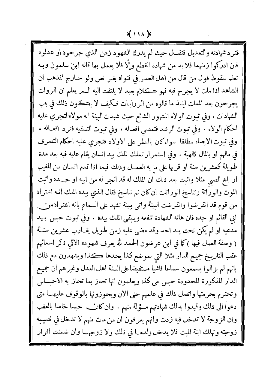فترد شهادته والتعديل فتقبل حيث لم يدرك الشهود زمن الذي جرحوه أو عدلوه فإن أدركوا زمنها فلابد من شهادة القطع وإلا فلا يعمل بها قاله ابن سلمون وبه تعلم سقوط قول من قال من أهل العصر في فتواه بغير نص ولو خارج المذهب أن الشاهد إذا مات لا يجرح فيه فهو كلام بعيد لا يلتفت إليه ألم يعلم أن الروات يجرحون بعد الممات لينبذ ما قالوه من الروايات فكيف لا يكون ذلك في باب الشهادات. وفي ثبوت الولاء المشهور الشائع حيث شهدت البينة أنه مولاه لتجري عليه أحكام الولاء. وفي ثبوت الرشد فتمضي أفعاله. وفي ثبوت التسفيه فترد أفعاله. وفي ثبوت الإيصاء مطلقًا سواء كان بالنظر على الأولاد فتجري عليه أحكام التصرف في مالهم أو بالمال كالهبة. وفي استمرار تملك لملك بيد إنسان يقم عليه فيه بعد مدة طويلة كعشرين سنة أو قربها على ما به العمل وذلك فيما إذا قدم إنسان من المغيب أو بلغ الصبي مثلًا وأثبت بعد ذلك أن الملك له قد انجر له من أبيه أو جده وأثبت الموت والوراثة وتناسخ الوراثات أن كان ثم تناسخ فقال الذي بيده الملك أنه اشتراه من قوم قد انقرضوا وانقرضت البينة وأتى ببينة تشهد على السماع بأنه اشتراه من أبي القائم أو جده فإن هاته الشهادة تنفعه ويبقى الملك بيده. وفي ثبوت حبس بيد مدعيه أو لم يكن تحت يد أحد وقد مضى عليه زمن طويل يقارب عشرين سنة (وصفة العمل فيها) كما في ابن عرضون الحمد لله يعرف شهوده الآتي ذكر أسمائهم عقب التاريخ جميع الدار مثلًا التي بموضع كذا يحدها كذا ويشهدون مع ذلك بأنهم لم يزالوا يسمعون سماعًا فاشيًا مستفيضًا على السنة أهل العدل وغيرم أن جميع الدار المذكورة المحدودة حبس على كذا ويعلمون أنها تحاز بما تحاز به الأحباس وتحترم بحرمتها واتصل ذلك في علمهم حتى الآن ويحوزونها بالوقوف عليها متى دعوا إلى ذلك وقيدوا بذلك شهادتهم مسئولة منهم. وإن كان حبسًا خاصًا بالعقب وأن الزوجة لا تدخل فيه زدت وأنهم يعرفون أن من مات منهم لا تدخل في نصيبه زوجته وتهلك ابنة الميت فلا يدخل ولدها في ذلك ولا زوجها وإن ضمنت إقرار