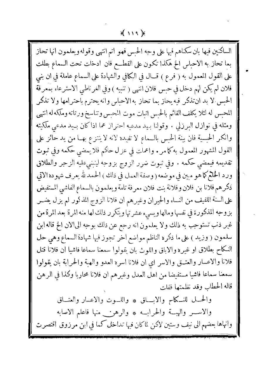 الساكنين فيها بأن سكناهم فيها على وجه الحبس فهو أتم انتهى وقوله ويعلمون أنها تحاز بما تحاز به الأحباس إلخ هكذا تكون على القطع فإن أدخلت تحت السماع بطلت على القول المعمول به (فرع) قال في الكافي والشهادة على السماع عاملة في أن بني فلان لم يكن لهم دخل في حبس فلان انتهى (تنبيه) وفي الغرناطي الاسترعاء بمعرفة الحبس لابد أن تذكر فيه يحاز بما تحاز به الأحباس وأنه يحترم باحترامها ولا تذكر المحبس له لئلا يكلف القائم بالحبس إثبات موت المحبس وتتناسخ ورثاته وملكه له انتهى ومثله في نوازل البرزلي. وقولنا بيد مدعيه احتراز عما إذا كان بيد مدعي ملكيته وأنكر الحبيسة فإن بينة الحبس بالسماع لا تفيده لأنه لا ينتزع بها من يد حائز على القول المشهور المعمول به كما مر. وأعملت في عزل حاكم فلا يمضي حكمه وفي ثبوت تقديمه فيمضي حكمه. وفي ثبوت ضرر الزوج بزوجه لينبني عليه الزجر والطلاق ورد الخلع كما هو مبين في موضعه (وصفة العمل في ذلك) الحمد لله يعرف شهوده الآتي ذكرهم فلانًا بن فلان وفلانة بنت فلان معرفة تامة ويعلمون بالسماع الفاشي المستفيض على السنة اللفيف من النساء والجيران وغيرهم أن فلانًا الزوج المذكور لم يزل يضر بزوجه المذكورة في نفسها ومالها ويسيء عشرتها ويتكرر ذلك لها منه المرة بعد المرة من غير ذنب تستوجب به ذلك ولا يعلمون أنه رجع عن ذلك بوجه إلى الآن إلخ قاله ابن سلمون (وزيد) على ما ذكره الناظم مواضع أخر تجوز فيها شهادة السماع وهي حل النكاح بطلاق أو غيره وإلا باق واللوث بأن يقولوا سمعنا سماعًا فاشيًا أن فلانًا قتل فلانًا والإعسار والعتق والأسر أي أن فلانًا أسره العدو والهبة والحرابة بأن يقولوا سمعنا سماعًا فاشيًا مستفيضًا من أهل العدل وغيرهم أن فلانًا محاربًا وكذا في الرهن قاله الحطاب وقد نظمتها فقلت