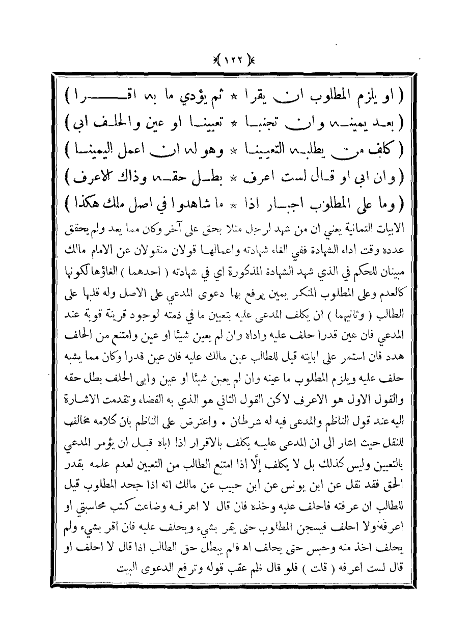 الأبيات الثمانية يعني أن من شهد لرجل مثلًا بحق على آخر وكان مما يعد ولم يحقق عدده وقت أداء الشهادة ففي إلغاء شهادته وأعمالها قولان منقولان عن الإمام مالك مبينان للحكم في الذي شهد الشهادة المذكورة أي في شهادته (أحدهما) إلغاؤها لكونها كالعدم وعلى المطلوب المنكر يمين يرفع بها دعوى المدعي على الأصل وله قلبها على الطالب (وثانيهما) أن يكلف المدعى عليه بتعيين ما في ذمته لوجود قرينة قوية عند المدعي فإن عين قدرا حلف عليه وأداه وإن لم يعين شيئًا أو عين وامتنع من الحلف هدد فإن استمر على إبايته قيل للطالب عين مالك عليه فإن عين قدرًا وكان مما يشبه حلف عليه ويلزم المطلوب ما عينه وإن لم يعين شيئًا أو عين وأبى الحلف بطل حقه والقول الأول هو الأعرف لكن القول الثاني هو الذي به القضاء وتقدمت الإشارة إليه عند قول الناظم والمدعى فيه له شرطان. واعترض على الناظم بأن كلامه مخالف للنقل حيث أشار إلى أن المدعى عليه يكلف بالإقرار إذا أباه قبل أن يؤمر المدعي بالتعيين وليس كذلك بل لا يكلف إلا إذا امتنع الطالب من التعيين لعدم علمه بقدر الحق فقد نقل عن ابن يونس عن ابن حبيب عن مالك أنه إذا جحد المطلوب قيل للطالب أن عرفته فاحلف عليه وخذه فإن قال لا أعرفه وضاعت كتب محاسبتي أو أعرفه ولا أحلف فيسجن المطلوب حتى يقر بشيء ويحلف عليه فإن أقر بشيء ولم يحلف أخذ منه وحبس حتى يحلف اهـ فلم يبطل حق الطالب إذا قال لا أحلف أو قال لست أعرفه (قلت) فلو قال ظم عقب قوله وترفع الدعوى البيت