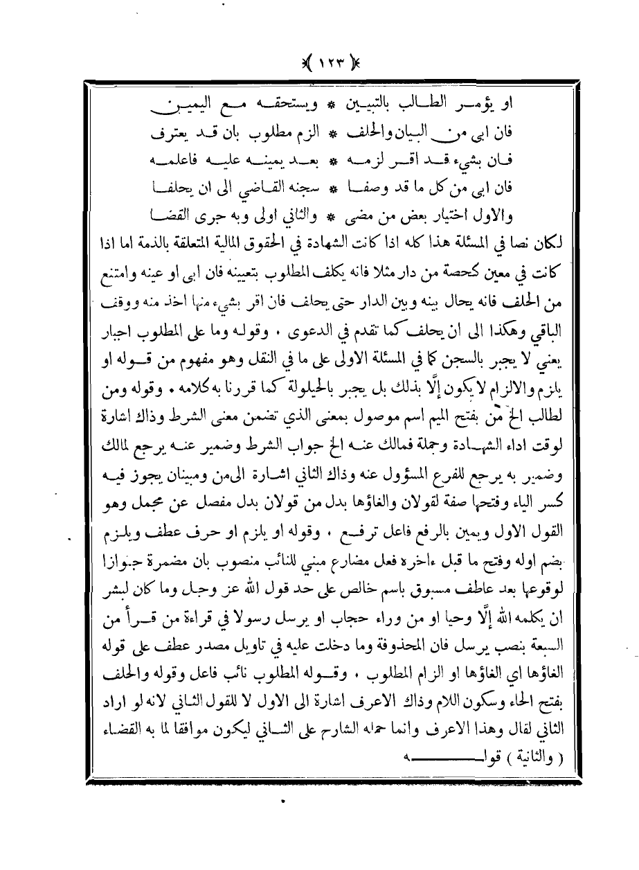 لكان نصًا في المسألة هذا كله إذا كانت الشهادة في الحقوق المالية المتعلقة بالذمة أما إذا كانت في معين كحصة من دار مثلًا فإنه يكلف المطلوب بتعيينه فإن أبى أو عينه وامتنع من الحلف فإنه يحال بينه وبين الدار حتى يحلف فإن أقر بشيء منها أخذ منه ووقف الباقي وهكذا إلى أن يحلف كما تقدم في الدعوى. وقوله وما على المطلوب إجبار يعني لا يجبر بالسجن كما في المسألة الأولى على ما في النقل وهو مفهوم من قوله أو يلزم والإلزام لا يكون إلا بذلك بل يجبر بالحيلولة كما قررنا به كلامه. وقوله ومن لطالب إلخ من بفتح الميم اسم موصول بمعنى الذي تضمن معنى الشرط وذاك إشارة لوقت أداء الشهادة وجملة فمالك عنه إلخ جواب الشرط وضمير عنه يرجع لمالك وضمير به يرجع للفرع المسؤول عنه وذاك الثاني إشارة إلى من ومبينان يجوز فيه كسر الياء وفتحها صفة لقولان والغاؤها بدل من قولان بدل مفصل عن مجمل وهو القول الأول ويمين بالرفع فاعل ترفع. وقوله أو يلزم أو حرف عطف ويلزم بضم أوله وفتح ما قبل آخره فعل مضارع مبني للنائب منصوب بأن مضمرة جوازًا لوقوعها بعد عاطف مسبوق باسم خالص على حد قول الله عز وجل {وما كان لبشر أن يكلمه الله إلا وحيًا أو من وراء حجاب أو يرسل رسولًا} في قراءة من قرأ من السبعة بنصب يرسل فإن المحذوفة وما دخلت عليه في تأويل مصدر عطف على قوله الغاؤها أي إلغاؤها أو إلزام المطلوب. وقوله المطلوب نائب فاعل وقوله والحلف بفتح الحاء وسكون اللام وذاك الأعرف إشارة إلى الأول لا للقول الثاني لأنه لو أراد الثاني لقال وهذا الأعرف وإنما حمله الشارح على الثاني ليكون موافقًا لما به القضاء (والثانية) قوله