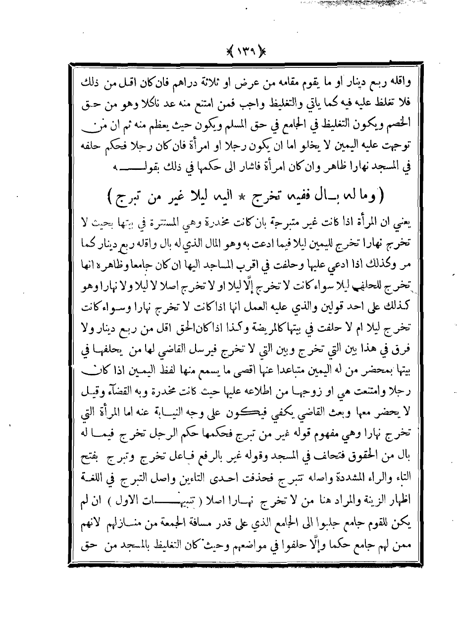 وأقله ربع دينار أو ما يقوم مقامه من عرض أو ثلاثة دراهم فإن كان أقل من ذلك فلا تغلظ عليه فيه كما يأتي والتغليظ واجب فمن امتنع منه عد ناكلا وهو من حق الخصم ويكون التغليظ في الجامع في حق المسلم ويكون حيث يعظم منه ثم أن من توجهت عليه اليمين لا يخلو أما أن يكون رجلا أو امرأة فإن كان رجلا فحكم حلفه في المسجد نهارًا ظاهر وإن كان امرأة فأشار إلى حكمها في ذلك بقوله