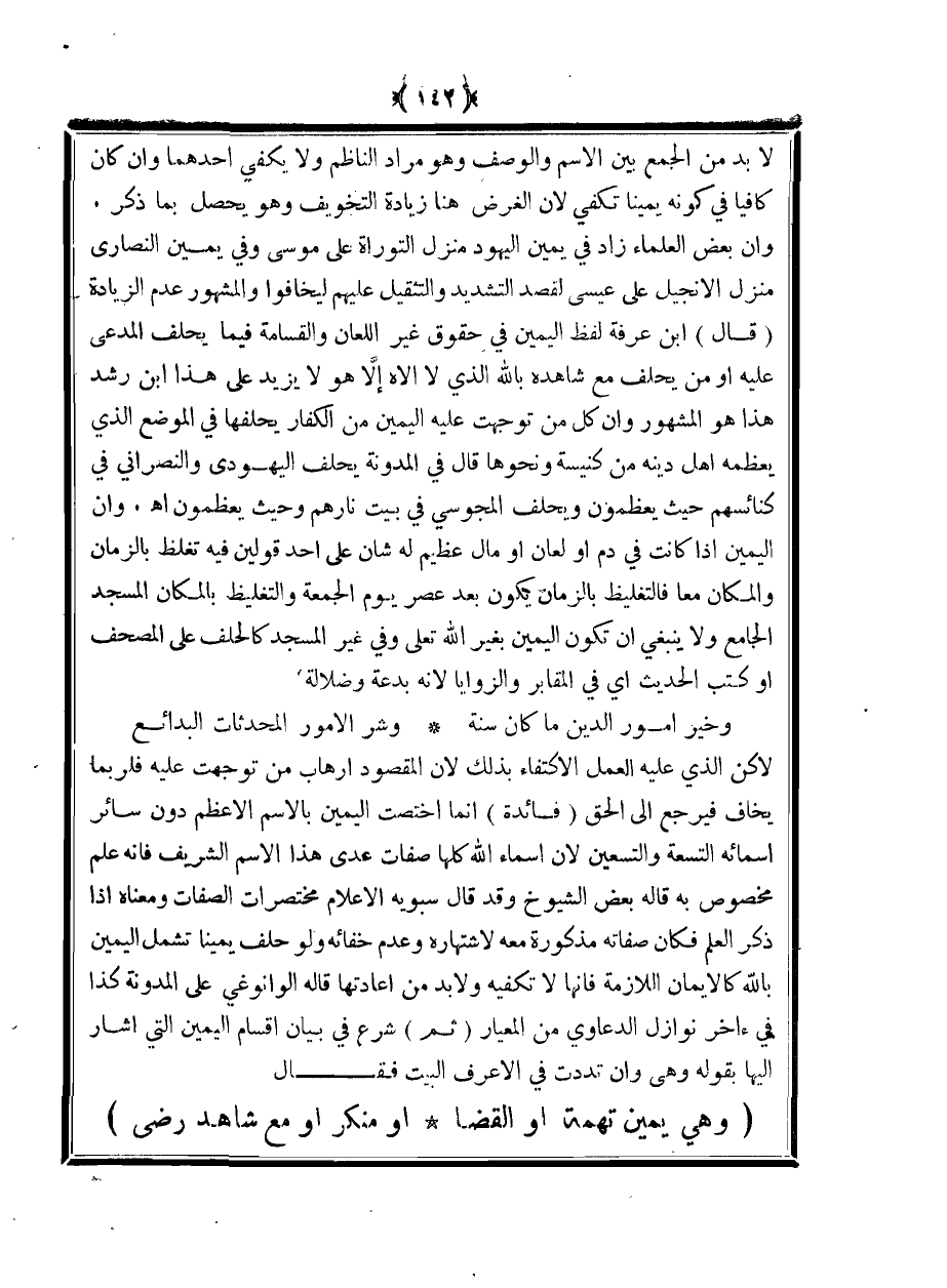 لابد من الجمع بين الاسم والوصف وهو مراد الناظم ولا يكفي أحدهما وإن كان كافيًا في كونه يمينًا تكفي لأن الغرض هنا زيادة التجويف وهو يحصل بما ذكر. وأن بعض العلماء زاد في يمين اليهود منزل التوراة على موسى وفي يمين النصارى منزل الإنجيل على عيسى لفصد التشديد والتثقيل عليهم ليخافوا والمشهور عدم الزيادة (قال) ابن عرفة لفظ اليمين في حقوق غير اللعان والقسامة فيما يحلف المدعى عليه أو من يحلف مع شاهده بالله الذي لا إله إلا هو لا يزيد على هذا ابن رشد هذا هو المشهور وأن كل من توجهت عليه اليمين من الكفار يحلفها في الموضع الذي يعظمه أهل دينه من كنيسة ونحوها قال في المدونة يحلف اليهودي والنصراني في كنائسهم حيث يعظمون ويحلف المجوسي في بيت نارهم وحيث يعظمون اهـ. وإن اليمين إذا كانت في دم أو لعان أو مال عظيم له شأن على أحد قولين فيه تغلظ بالزمان والمكان معا فالتغليظ بالزمان يكون بعد عصر يوم الجمعة والتغليظ بالمكان المسجد الجامع ولا ينبغي أن تكون اليمين بغير الله تعالى وفي غير مسجد كالحلف على المصحف أ, كتب الحديث أي في المقابر والزوايا لأنه بدعة وضلالة.