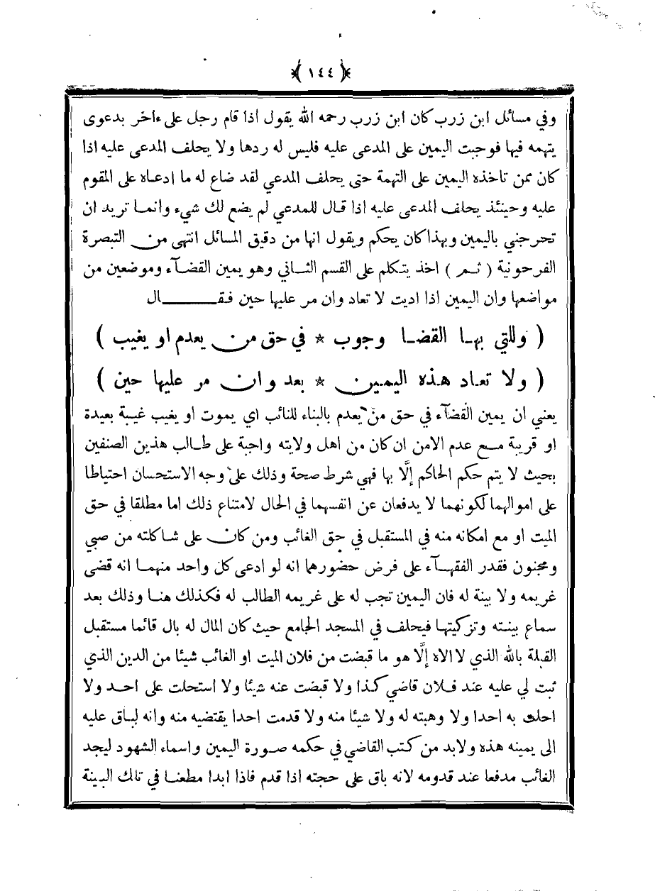 وفي مسائل ابن زرب كان ابن زرب رحمه الله يقول إذا قام رجل على آخر بدعوى يتهمه فيها فوجبت اليمين على المدعى عليه فليس له ردها ولا يحلف المدعى عليه إذا كان ممن تأخذه اليمين على التهمة حتى يحلف المدعي لقد ضاع له ما ادعاه على المقوم عليه وحينئذ يحلف المدعى عليه إذا قال للمدعي لم يضع لك شيء وإنما تريد أن تحرجني باليمين وبهذا كان يحكم ويقول أنها من دقيق المسائل انتهى من التبصرة الفرحونية (ثم) أخذ يتكلم على القسم الثاني وهو يمين القضاء وموضعين من مواضعها وأن اليمين إذا أديت لا تعاد وإن مر عليها حين فقال