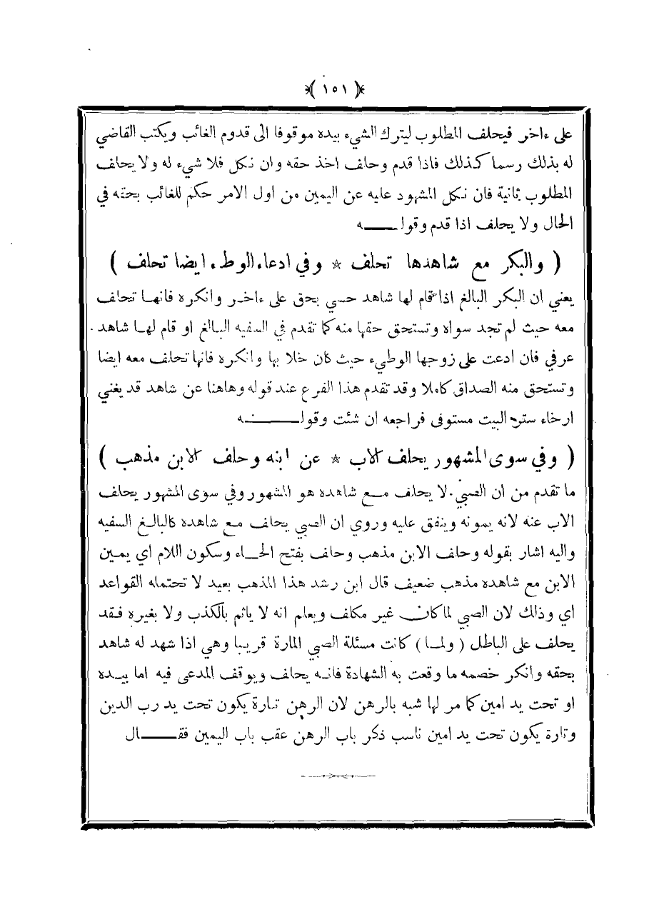 ما تقدم من أن الصبي لا يحلف مع شاهده هو المشهور وفي سوى المشهور يحلف الأب عنه لأنه يمونه وينفق عليه وروي أن الصبي يحلف مع شاهده كالبالغ السفيه وإليه أشار بقوله وحلف الابن مذهب وحلف بفتح الحاء وسكون اللام أي يمين الابن مع شاهده مذهب ضعيف قال ابن رشد هذا المذهب بعيد لا تحتمله القواعد أي وذلك لأن الصبي لما كان غير مكلف ويعلم أنه لا يأثم بالكذب ولا بغيره فقد يحلف على الباطل (ولما) كانت مسئلة الصبي المارة قريبًا وهي إذا شهد له شاهد بحقه وأنكر خصمه ما وقعت به الشهادة فإنه يحلف ويوقف المدعى فيه أما بيده أو تحت يد أمين كما مر لها شبه بالرهن لأن الرهن تارة يكون تحت يد رب الدين وتارة يكون تحت يد أمين ناسب ذكر باب الرهن عقب باب اليمين فقال