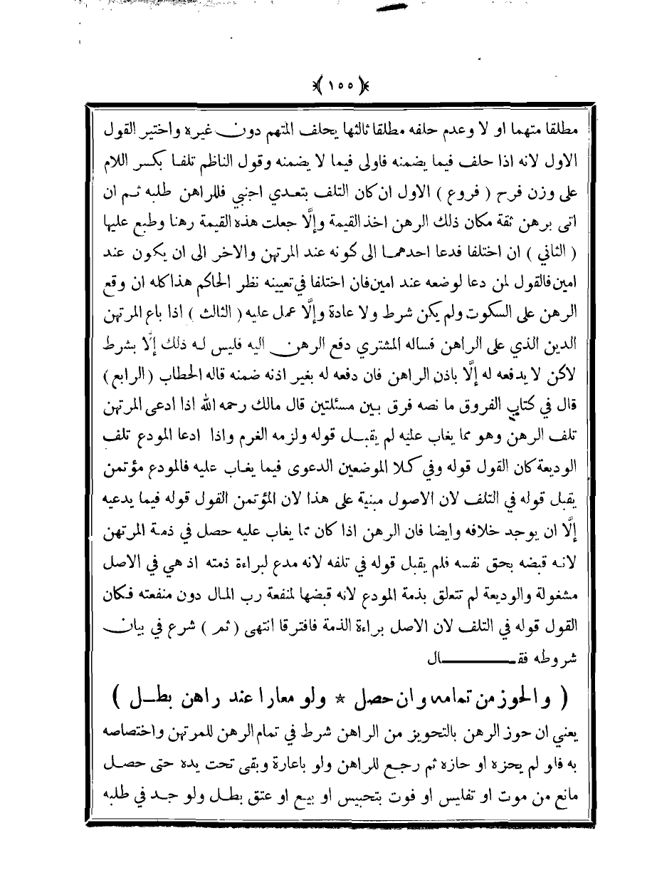 مطلقًا متهمًا أو لا وعدم حلفه مطلقًا ثالثها يحلف المتهم دون غيره واختير القول الأول لأنه إذا حلف فيما يضمنه فأولى فيما لا يضمنه وقول الناظم تلفا بكسر اللام على وزن فرح (فروع) الأول أن كان التلف بتعدي أجنبي فللراهن طلبه ثم أن أتى برهن ثقة مكان ذلك الرهن اخذ القيمة وإلا جعلت هذه القيمة رهنًا وطبع عليها (الثاني) أن اختلفا فدعا أحدهما إلى كونه عند المرتهن والآخر إلى أن يكون عند أمين فالقول لمن دعا لوضعه عند أمين فإن اختلفا في تعيينه نظر الحاكم هذا كله أن وقع الرهن على السكوت ولم يكن شرط ولا عادة وإلا عمل عليه (الثالث) إذا باع المرتهن الدين الذي على الراهن فسأله المشتري دفع الرهن إليه فليس له ذلك إلا بشرط لكن لا يدفعه له إلا بإذن الراهن فإن دفعه له بغير إذنه ضمنه قاله الحطاب (الرابع) قال في كتاب الفروق ما نصه فرق بين مسئلتين قال مالك رحمه الله إذا ادعى المرتهن تلف الرهن وهو مما يغاب عليه لم يقبل قوله ولزمه الغرم وإذا ادعا المودع تلف الوديعة كان القول قوله وفي كلا الموضعين الدعوى فيما يغاب عليه فالمودع مؤتمن يقبل قوله في التلف لأن الأصول مبنية على هذا لأن المؤتمن القول قوله فيما يدعيه إلا أن يوجد خلافه وأيضا فإن الرهن إذا كان مما يغاب عليه حصل في ذمة المرتهن لأنه قبضه بحق نفسه فلم يقبل قوله في تلفه لأنه مدع لبراءة ذمته إذ هي في الأصل مشغولة والوديعة لم تتعلق بذمة المودع لأنه قبضها لمنفعة رب المال دون منفعته فكان القول قوله في التلف لأن الأصل براءة الذمة فافترقا انتهى (ثم) شرع في بيان شروطه فقال