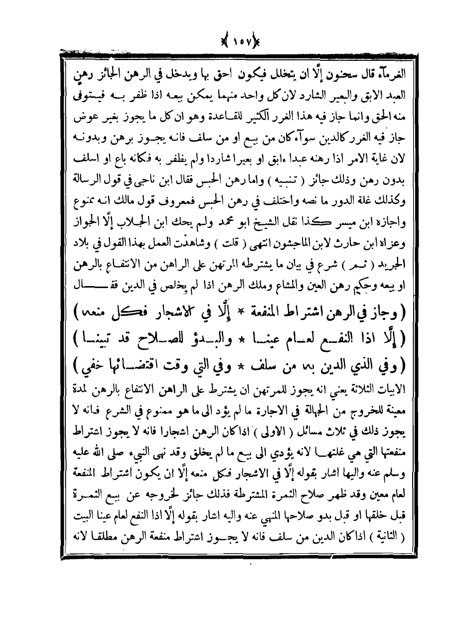 الأبيات الثلاثة يعني أنه يجوز للمرتهن أن يشترط على الراهن الانتفاع بالرهن لمدة معينة للخروج من الجهالة في الإجارة ما لم يؤد إلى ما هو ممنوع في الشرع فإنه لا يجوز ذلك في ثلاث مسائل (الأولى) إذا كان الرهن أشجارًا فإنها لا يجوز اشتراط منفعتها التي هي غلتها لأنه يؤدي إلى بيع ما لم يخلق وقد نهى النبي صلى الله عليه وسلم عنه وإليها أشار بقوله إلا في الأشجار فكل منعه إلا أن يكون اشتراط المنفعة لعام معين وقد ظهر صلاح الثمرة المشترطة فذلك جائز لخروجه عن بيه الثمرة قبل خلقها أو قبل بدو صلاحها المنهي عنه وإليه أشار بقوله إلا إذا النفع لعام عينا البيت (الثانية) إذا كان الدين من سلف فإنه لا يجوز اشتراط منفعة الرهن مطلقًا لأنه