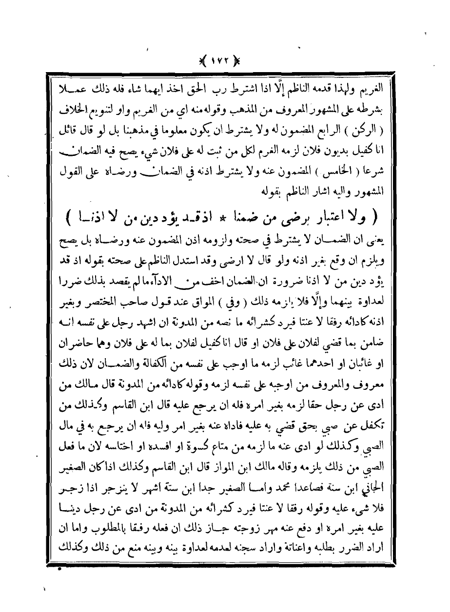 يعني أن الضمان لا يشترط في صحته ولزومه إذن المضمون عنه ورضه بل يصح ويلزم أن وقع بغير إذنه ولو قال لا أرضى وقد استدل الناظم على صحته بقوله إذ قد يؤد دين من لا إذنا ضرورة أن الضمان أخف من الاداء ما لم يقصد بذلك ضررًا لعداوة بينهما وإلا فلا يلزمه ذلك (وفي) المواق عند قول صاحب المختصر وبغير أنه كأدائه رفقا لا عنتا فيرد كشرائه ما نصه من المدونة أن أشهد رجل على نفسه أنه ضامن بما قضي لفلان على فلان أو قال أنا كفيل لفلان بما له على فلان وهما حاضران أو غائبان أو أحدهما غائب لزمه ما أوجب على نفسه من الكفالة والضمان لأن ذلك معروف والمعروف من أوجبه على نفسه لزمه وما قوله كأدائه من لمدونة قال مالك من أدى عن رجل حقا لزمه بغير أمره فله أن يرجع وقوله كأدئه من المدونة قال مالك من أدى عن رجل حقا لزمه بغير أمره فله أن يرجع عليه قال ابن القاسم وكذلك من تكفل عن صبي بحق قضي به عليه فأداه عنه بغير أمر وليه فله أن يرجع به في مال الصبي وكذلك لو أدى عنه ما لزمه من متاع كسوة أو أفسده أو اختلسه لأن ما فعل الصبي من ذلك يلزمه وقاله مالك ابن المواز قال ابن القاسم وكذلك إذا كان الصغير الجاني ابن سنة فصاعدا محمد وأما الصغير جدا ابن ستة أشهر لا ينزجر إذا زجر فلا شيء بغير أمره أو دفع عه مهر زوجته جاز ذلك أن فعله رفقًا بالمطلوب وأما أن أراد الضرر بطلبه وإعناته وأراد سجنه لعدمه لعداوة بينه وبينه منع من ذلك وكذلك