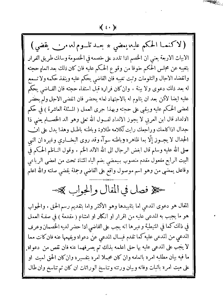 الأبيات الأربعة يعني أن الخصم إذا تلذذ على خصمه في الخصومة وسلك طريق الفرار بتغيبه عن مجلس الحكم خوفا من وقوع الحكم عليه فإن كان ذلك بعد إتمام حجته وانقضاء الآجال والتلومات وثبت تغيبه فإن القاضي يحكم عليه وينفذ حكمه ولا تسمع له بعد ذلك دعوى ولا بينة. وإن كان فراره قبل استفاء حجته فإن القاضي يحكم عليه أيضا لكن بعد أن يتلوم له بالاجتهاد لعله يحضر فإن انقضى الأجل ولم يحضر وأمضى الحكم عليه ويبقى على حجته وبهذا جرى العمل (المسألة العاشرة) في حكم الالداد قال أبن العربي لا يجوز الالداد لقول الله تعالى {وهو ألد الخصام} يعني ذا جدال إذا كلمك وراجعك رأيت لكلامه طلاوة وباطنه باطل وهذا يدل على أن الجدال لا يجوز إلا بما ظاهره وباطنه سواء وقد روى البخاري وغيره أن النبي صلى الله عليه وسلم قال أبغض الرجال إلى الله الالد الخصام. وقول الناظم الحكم في البيت الرابع مفعول مقدم منصوب بيمضي بضم الياء المثناة تحت من أمضى الرباعي وفاعل يمضي من وهو اسم موصول واقع على القاضي وجملة يقضي صلته والله أعلم