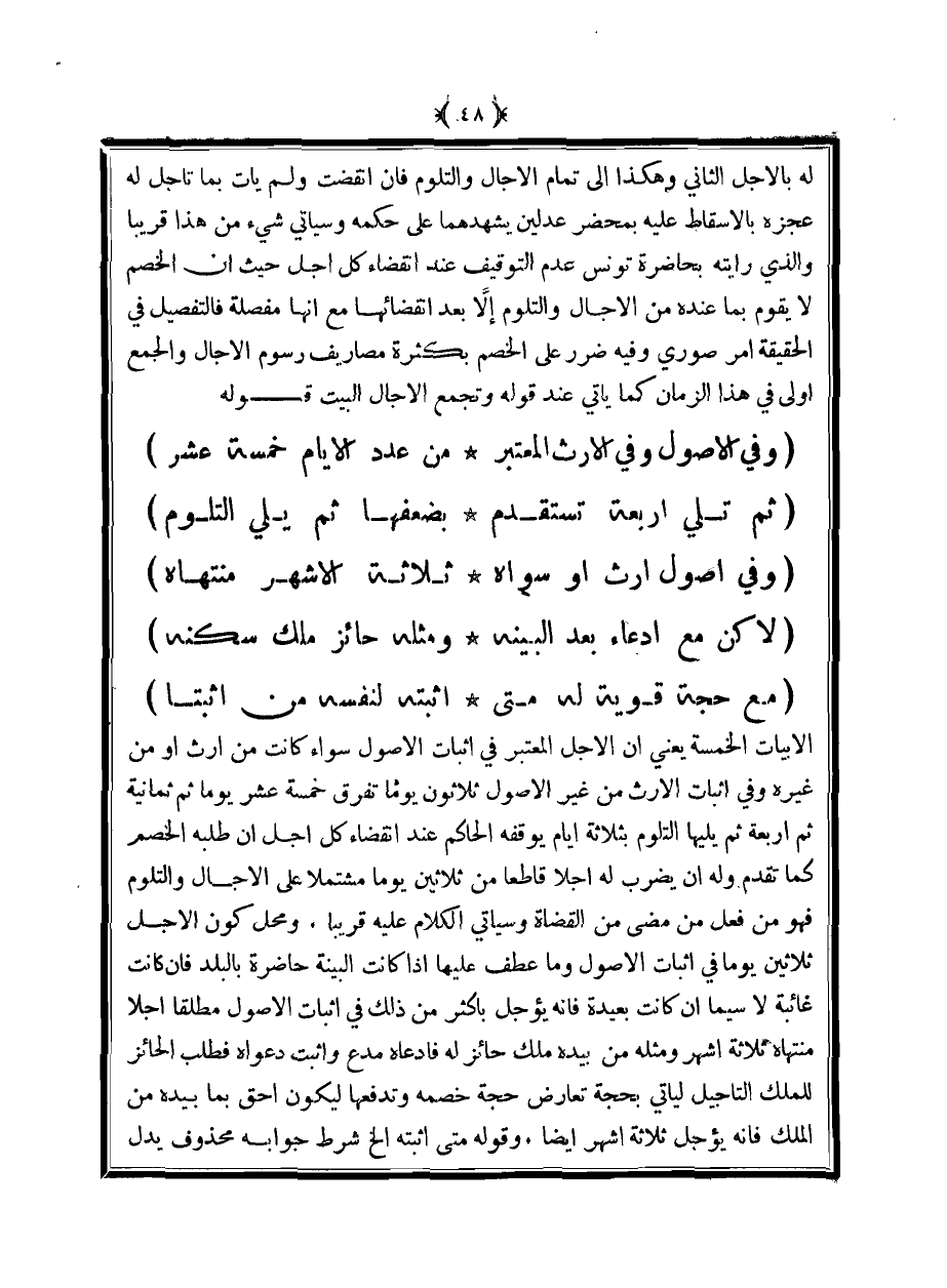 الابيات الخمسة يعني أن الأجل المعتبر في اثبات الاصول سواء كانت من ارث أو من غيره وفي اثبات الارث من غير الاصول ثلاثون يوما تفرق خمسة عشر يوما ثم ثمانيه ثم اربعه ثم تليها التلوم بثلاثة ايام يوقفه الحاكم عند انقضاء كل أجل أن طلبه الخصم كما تقدم وله أن يضرب له اجلا قاطعا ثلاثين يوما مشتملا على الاجال والتلوم فهو من فعل ما مضى من القضاه وسياتي الكلام عليه قريبا. ومحل كون الأجل ثلاثين يوما في اثبات الاصول وما عطف عليها إذا كانت البيئه حاضرة بالبلد فإن كانت غائبه فلا سيما أن كانت بعيده فانه يؤجل اكثر من ذلك في اثبات الاصول مطلقا اجلا منتهاه ثلاثة اشهر ومثله من بيده ملك حائز فادعاه مدع واثبت دعواه فطلب الحائز للملك التاجيل ليأتي بحجة تعارض حجة خصمه وتدفعها ليكون احق بما بيده من المالك فانه يؤجل ثلاثة اشهر ايضا. وقوله متى اثبته الخ شرط جوابه محذوف يدل