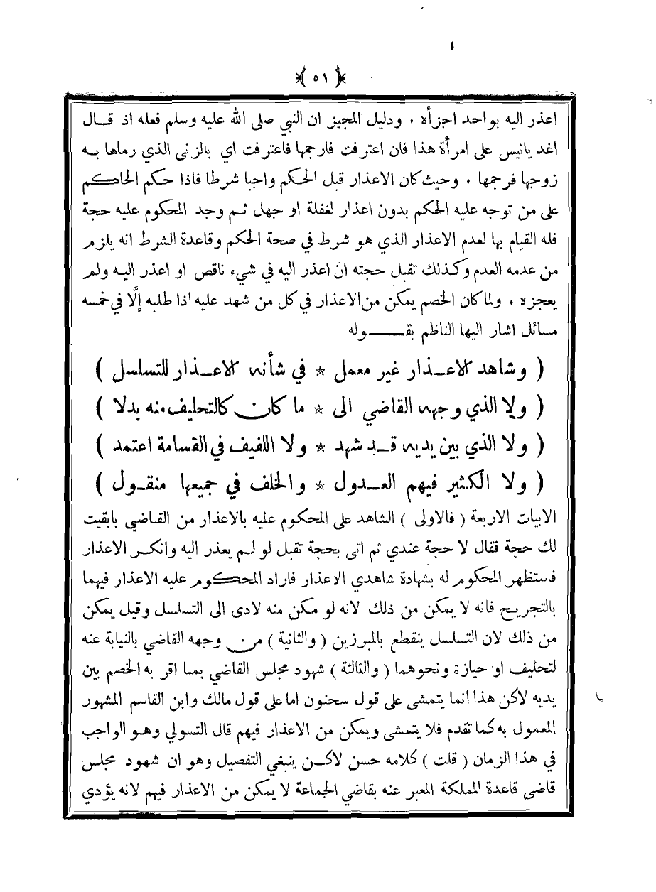 أعذر إليه بواحد أجزأه. ودليل المجيز أن النبي صلى الله عليه وسلم فعله إذ قال اغد يانيس على امرأة هذا فإن اعترفت فارجمها فاعترفت أي بالزنى الذي رماها به زوجها فرجمها. وحيث كان الإعذار قبل الحكم واجبًا شرطًا فإذا حكم الحاكم على من توجه عليه الحكم بدون إعذار لغفلة أو جهل ثم وجد المحكوم عليه حجة فله القيام بها لعدم الإعذار الذي هو شرط في صحة الحكم وقاعدة الشرط أنه يلزم من عدمه العدم وكذلك تقبل حجته أن اعذر إليه في شيء ناقص أو اعذر إليه ولم يعجزه. ولما كان الخصم يمكن من الإعذار في كل من شهد عليه إذا طلبه إلا في خمسة مسائل أشار إليها الناظم بقوله