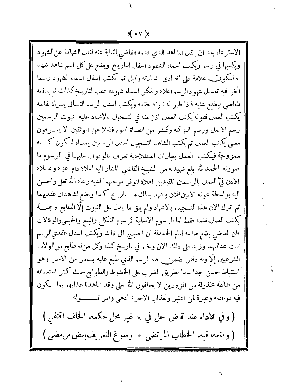 الاسترعاء بعد أن ينقل الشاهد الذي قدمه القاضي بالنيابة عنه لنقل الشهادة عن الشهود ويكتبها في رسم ويكتب أسماء الشهود أسفل التاريخ ويضع على كل اسم شاهد شهد به ليكون علامة على أنه أدى شهادته وقبل ثم يكتب أسفل أسماء الشهود رسمًا آخر فيه تعديل شهود الرسم أعلاه ويذكر أسماء شهوده عقب التاريخ كذلك ثم يدفعه للقاضي ليطلع عليه فإذا ظهر له ثبوته ختمه ويكتب أسفل الرسم الثاني يسراه بقلمه يكتب العمل فقوله يكتب العمل إذن منه في التسجيل بالإشهاد عليه بثبوت الرسمين رسم الأصل ورسم التزكية وكثير من القضاة اليوم فضلا عن الموثقين لا يعرفون معنى يكتب العمل ثم يكتب الشاهد التسجيل أسفل الرسمين يمناه لتكون كتابته ممزوجة فيكتب العمل بعبارات اصطلاحية تعرف بالوقوف عليها في الرسوم ما صورته الحمد لله بلغ شهيديه من الشيخ القاضي المشار إليه أعلاه دام عزه وعلاه الإذن في العمل بالرسمين المقيدين أعلاه لتوفر موجبهما لديه رعاه الله تعالى وأحسن إليه بواسطة عونه الأمين فلان وشهد بذلك هنا بتاريخ كذا ويضع الشاهدان عقديهما ثم ترك الآن هذا التسجيل بالإشهاد ولم يبق ما يدل على الثبوت إلا الطابع وجملة يكتب العمل بقلمه فقط أما الرسوم الأصلية كرسوم النكاح والبيع والحبس والوكالات فإن القاضي يضع طابعه أمام الحمدلة أن احتيج إلى ذلك ويكتب أسفل عقدي الرسم ثبتت عدالتهما وزيد على ذلك الآن وختم في تاريخ كذا وكل من له طابع من الولات الشرعيين إلا وله دفتر يضمن فيه الرسم الذي طبع عليه بأمر من الأمير وهو استنباط حسن جدًا سدًا لطريق الضرب على الخطوط والطوابع حيث كثر استعماله من طائفة مخذولة من المزورين لا يخافون الله تعالى وقد شاهدنا عذابهم بما يكون فيه موعضة وعبرة لمن اعتبر ولعذاب الآخرة أدهى وأمر قوله