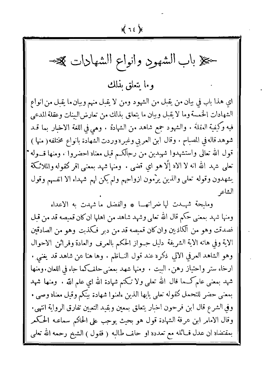 أي هذا باب في بيان من يقبل من الشهود ومن لا يقبل منهم وبيان ما يقبل من أنواع الشهادات الخمسة وما لا يقبل وبيان ما يتعلق بذلك من تعارض البينات وعقلة المدعى فيه وكيفية العقلة. والشهود جمع شاهد من الشهادة. وهي في اللغة الإخبار بما قد شوهد قاله في المصباح. وقال ابن العربي وغيره وردت الشهادة بأنواع مختلفة (منها) قول الله تعالى {واستشهدوا شهيدين من رجالكم} قيل معناه احضروا. ومنها قوله تعالى {شهد الله أنه لا إله إلا هو} أي قضى. ومنها شهد بمعنى أقر كقوله والملائكة يشهدون وقوله تعالى {والذين يرمون أزواجهم ولم يكن لهم شهداء إلا أنفسهم} وقول الشاعر