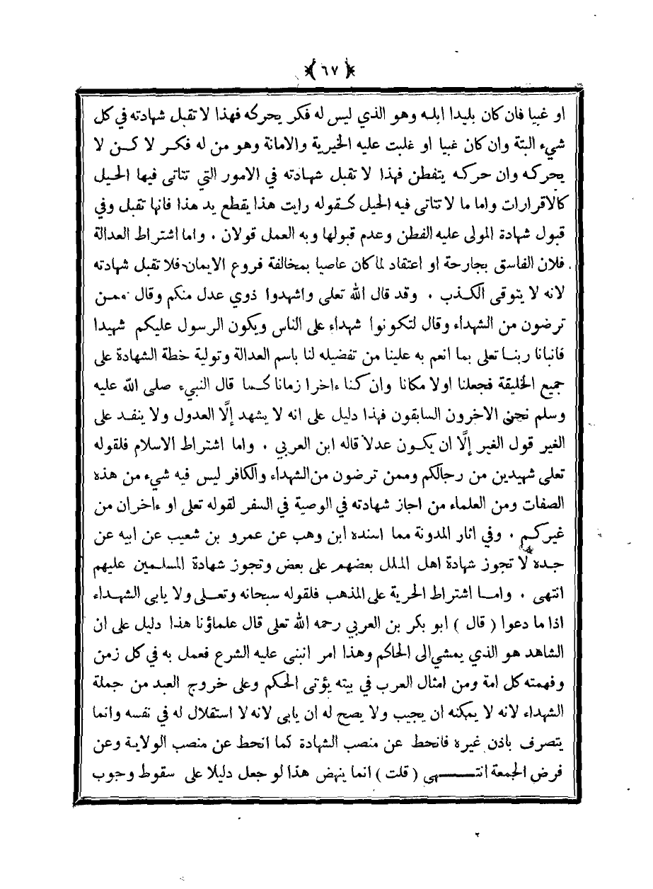 أو غبيًا فإن كان بليدًا أبله وهو الذي ليس له فكر يحركه فهذا لا تقبل شهادته في كل شيء البتة وإن كان غبيًا أو غلبت عليه الخيرية والأمانة وهو من له فكر لكن لا يحركه وإن حركه يتفطن فهذا لا تقبل شهادته في الأمور التي تتأتى فيها الحيل كالإقرارات وأما ما لا تتأتى فيه الحيل كقوله رأيت هذا يقطع يد هذا فإنها تقبل وفي قبول شهادة المولى عليه الفطن وعدم قبولها وبه العمل قولان. وأما اشتراط العدالة فلأن الفاسق بجارحة أو اعتقاد لما كان عاصيًا بمخالفة فروع الإيمان فلا تقبل شهادته لأنه لا يتوقى الكذب. وقد قال الله تعالى {وأشهدوا ذوي عدل منكم} وقال {ممن ترضون من الشهداء} وقال {لتكونوا شهداء على الناس ويكون الرسول عليكم شهيدًا} فأنبأنا ربنا تعالى بما أنعم به علينا من تفضيله لنا باسم العدالة وتولية خطة الشهادة على جميع الخليقة فجعلنا أولًا مكانًا وإن كنا آخرًا زمانًا كما قال النبي صلى الله عليه وسلم نحن الآخرون السابقون فهذا دليل على أنه لا يشهد إلا العدول ولا ينفد على الغير قول الغير إلا أن يكون عدلًا قاله ابن العربي. وأما اشتراط الإسلام فلقوله تعالى {شهيدين من رجالكم وممن ترضون من الشهداء} والكافر ليس فيه شيء من هذه الصفات ومن العلماء من أجاز شهادته في الوصية في السفر لقوله تعالى {أو آخران من غيركم}. وفي آثار المدونة مما أسنده ابن وهب عن عمرو بن شعيب عن أبيه عن جده لا تجوز شهادة أهل الملل بعضهم على بعض وتجوز شهادة المسلمين عليهم انتهى. وأما اشتراط الحرية على المذهب فلقوله سبحانه وتعالى ولا يأبى الشهداء إذا ما دعوا (قال) أبو بكر بن العربي رحمه الله تعالى قال علماؤنا هذا دليل على أن الشاهد هو الذي يمشي إلى الحاكم وهذا أمر انبنى عليه الشرع فعمل به في كل زمن وفهمته كل أمة ومن أمثال العرب في بيته يؤتى الحكم وعلى خروج العبد من جملة الشهداء لأنه لا يمكنه أن يجيب ولا يصح له أن يأبى لأنه لا استقلال له في نفسه وإنما يتصرف بإذن غيره فانحط عن منصب الشهادة كما انحط عن منصب الولاية وعن فرض الجمعة انتهى (قلت) إنما ينهض هذا لو جعل دليلًا على سقوط وجوب
