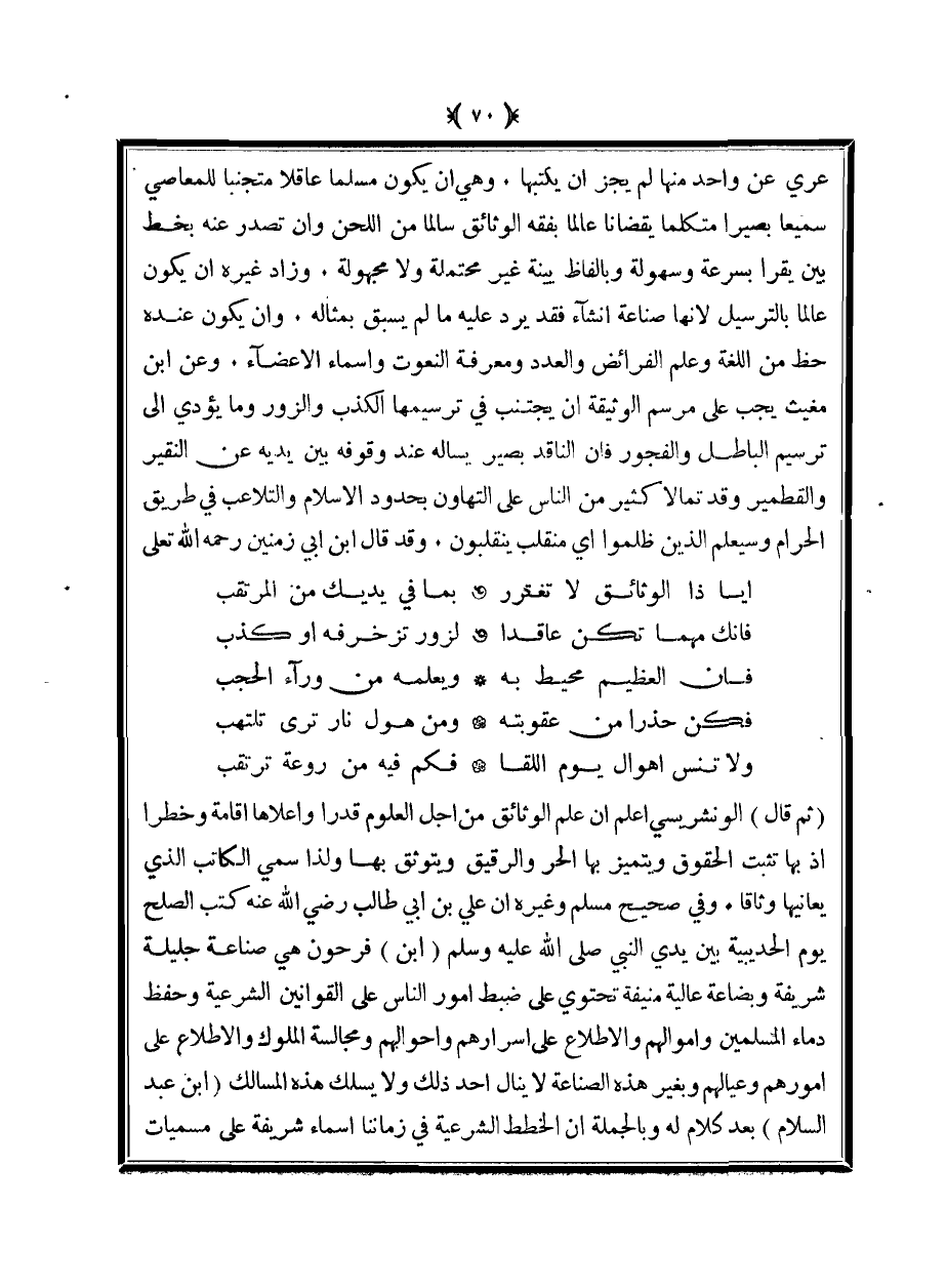 (ثم قال) الونشريسي اعلم أن علم الوثائق من أجل العلوم قدرًا وأعلاها إقامة وخطرً إذ بها تثبت الحقوق ويتميز بها الحر والرقيق ويتوثق بها ولذا سمي الكاتب الذي يعانيها وثاقا. وفي صحيح مسلم وغيره أن علي بن أبي طالب رضي الله عنه كتب الصلح يوم الحديبية بين يدي النبي صلى الله عليه وسلم (ابن) فرحون هي صناعة جليلة شريفة وبضاعة عالية منيفة تحتوي على ضبط أمور الناس على القوانين الشرعية وحفظ دماء المسلمين وأموالهم والاطلاع على أسرارهم وأحوالهم ومجالسة الملوك والاطلاع على أمورهم وعيالهم وبغير هذه الصناعة لا ينال أحد ذلك ولا يسلك هذه المسالك (ابن عبد السلام) بعد كلام له وبالجملة أن الخطط الشرعية في زماننا أسماء شريفة على مسميات