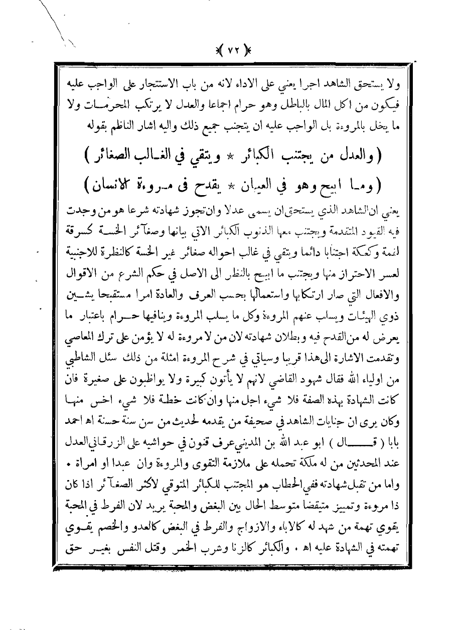 يعني أن الشاهد الذي يستحق أن يسمى عدلًا وأن تجوز شهادته شرعا هو من وجدت فيه القيود المتقدمة ويجتنب معها الذنوب الكبائر الآتي بيانها وصغائر الخسة كسرقة لقمة وكعكة اجتنابًا دائمًا ويتقي في غالب أحواله صغائر غير الخسة كالنظرة للأجنبية لعسر الاحتراز منها ويجتنب ما أبيح بالنظر إلى الأصل في حكم الشرع من الأقوال والأفعال التي صار ارتكابها واستعمالها بحسب العرف والعادة أمرًا مستقبحًا يشين ذوي الهيئات ويسلب عنهم المروءة وكل ما يسلب المروءة وينافيها حرام باعتبار ما يعرض له من القدح فيه وبطلان شهادته لأن من لا مروءة له لا يؤمن على ترك المعاصي وتقدمت الإشارة إلى هذا قريبًا وسيأتي في شرح المروءة أمثلة من ذلك سئل الشاطبي من أولياء الله فقال شهود القاضي لأنهم لا يأتون كبيرة ولا يواظبون على صغيرة فإن كانت الشهادة بهذه الصفة فلا شيء أجل منها وإن كانت خطة فلا شيء أخس منها وكان يرى أن جنايات الشاهد في صحيفة من يقدمه لحديث من سن سنة حسنة أه أحمد بابا (قال) أبو عبد الله بن المديني عرف قنون في حواشيه على الزرقاني العدل عند المحدثين من له ملكة تحمله على ملازمة التقوى والمروءة وأن عبدًا أو امرأة. وأما من تقبل شهادته ففي الحطاب هو المجتنب للكبائر المتوقي لأكثر الصغائر إذا كان ذا مروءة وتمييز متيقضا متوسط الحال بين البغض والمحبة يريد لأن الفرط في المحبة يقوي تهمة من شهد له كالآباء والأزواج والفرط في البغض كالعدو والخصم يقوي تهمته في الشهادة عليه اهـ. والكبائر كالزنا وشرب الخمر وقتل النفس بغير حق